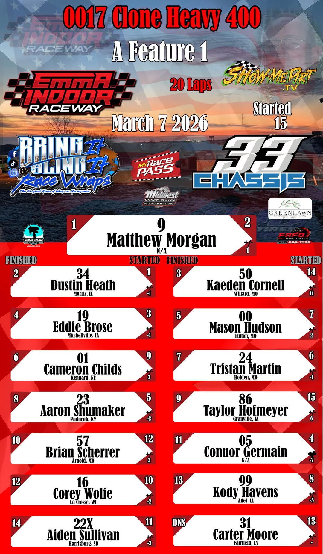 #DirtTrackRacing #LocalRacing #RaceResults #MyRacePass #ShowMeDirt #MidwestSheetMetal #SprayFoamNearMe #FAFOTireandAuto #BringItAndSlingIt #WrapOnHorsepower #33Chassis #3072026 #EmmaIndoorRacewayonMyRacePass #0017CloneHeavy400