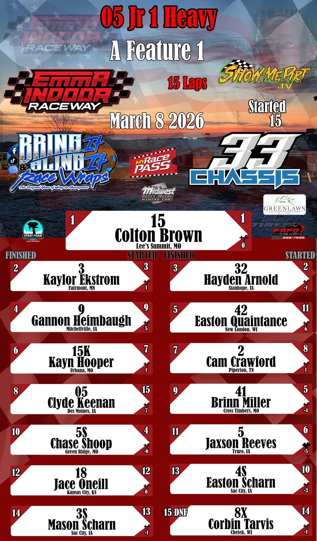 #DirtTrackRacing #LocalRacing #RaceResults #MyRacePass #ShowMeDirt #MidwestSheetMetal #SprayFoamNearMe #FAFOTireandAuto #BringItAndSlingIt #WrapOnHorsepower #33Chassis #3082026 #EmmaIndoorRacewayonMyRacePass #05Jr1Heavy