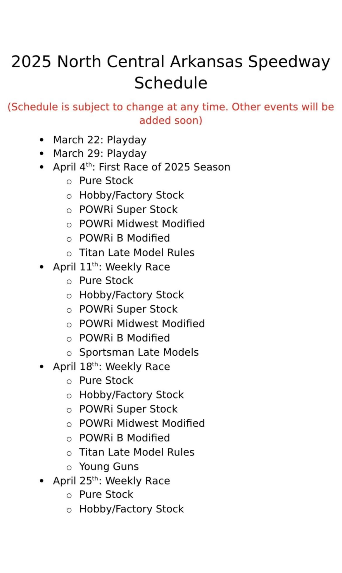 Uncategorized 2025 NCAS Schedule by Show-Me Dirt January 31, 2025 written by Show-Me Dirt January 31, 2025 692 ๐๐2025 NCAS Schedule๐๐ Source NCASSchedule 0 comments 0 FacebookTwitterPinterestThreadsBlueskyEmail Show-Me Dirt previous post 11th Annual Quad Winter Classic February 8, 2025 Here is the information. Pre-r… next post Full Event – Monett Motor Speedway – August 11 2024 Midwest Sheet Metal Com… You may also like HIGHLIGHT REEL TIME! at the Emma Indoor Raceway... November 2, 2025 Hands in the air! INSTANT REPLAY TIME! from... November 2, 2025 INSTANT REPLAY TIME! from the Emma Indoor Raceway... November 2, 2025 Kart Points race #1 Feature Winners Congratulations to... November 2, 2025 Congrats to all the Juice Box Winners from... November 2, 2025 Join our membership for early access to race... November 2, 2025 RACE RESULTS 11/1/2025 – Emma Indoor Raceway on... November 2, 2025 HEAT RACE RESULTS 11/1/2025 – Emma Indoor Raceway... November 2, 2025 Heat Races – Kart Points Race #1 at... November 1, 2025 It’s ๐ถ๐ท๐ฌ๐ต๐ฐ๐ต๐ฎ ๐ซ๐จ๐ at Emma Indoor Raceway! We... November 1, 2025
