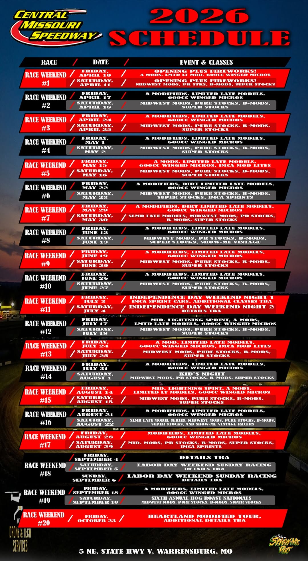 2026 Central Missouri Speedway Schedule. I have checked it twice and believe I have everything correct. If you find any errors, please let me know and I will update it. As always, check the tracks page for the most up-to-date information.