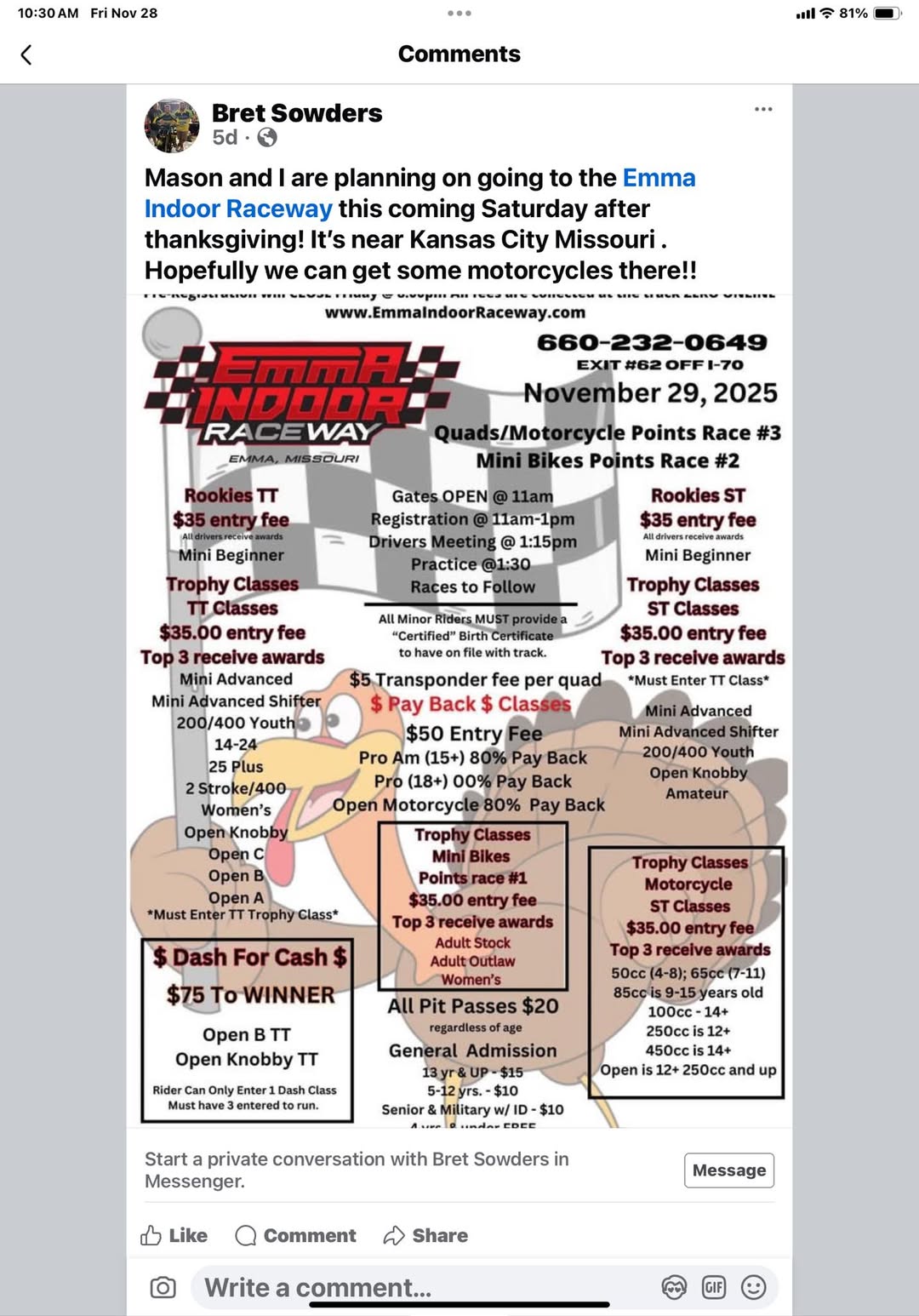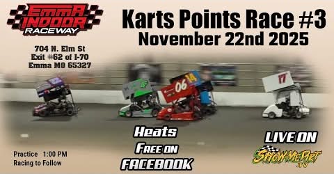 We will be live tomorrow at the Emma Indoor Raceway for the Quads/Motorcycle Points Race #3 & Mini Bikes Points Race #2 hot laps and heat races FREE here on Facebook.
