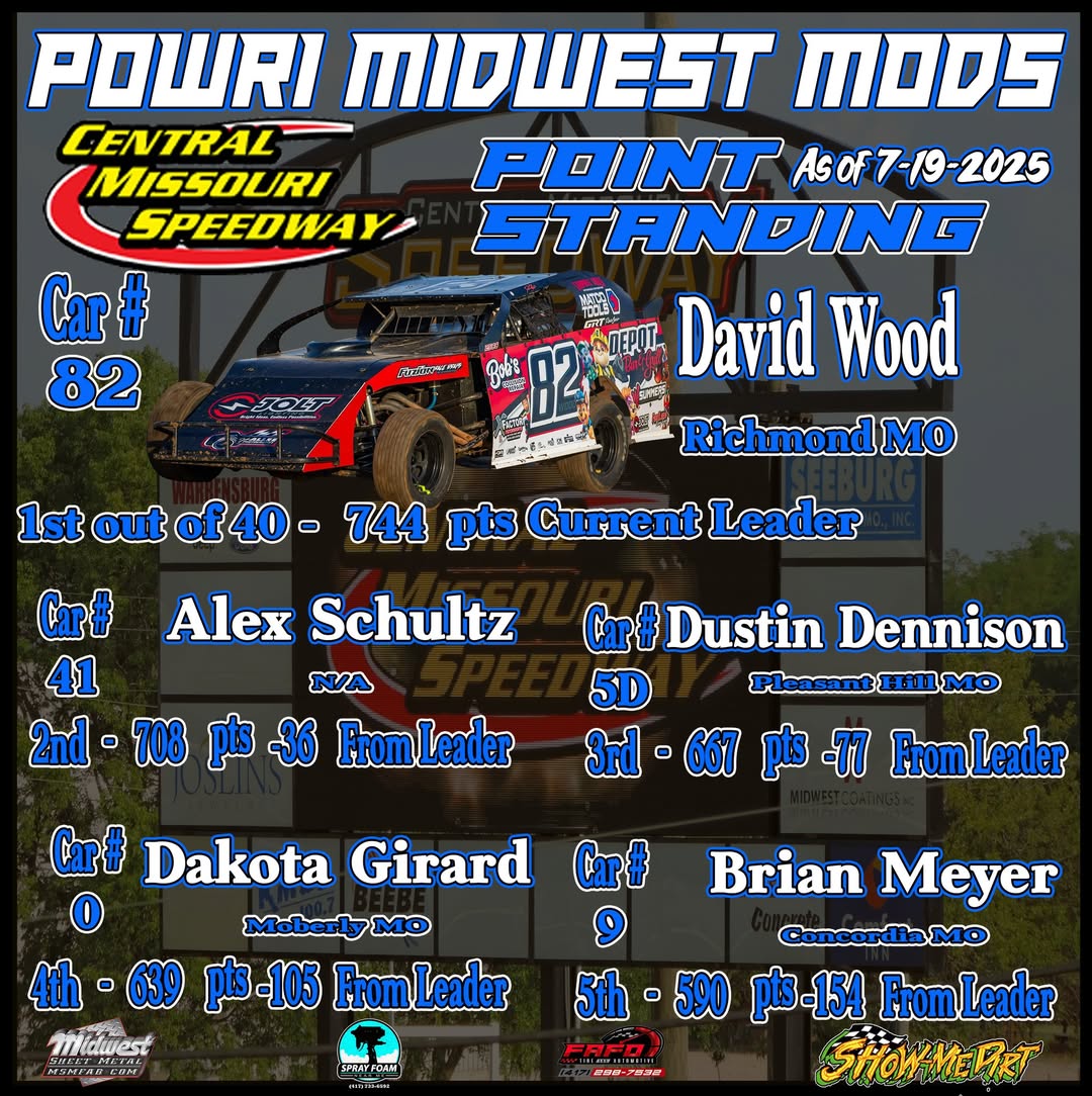 Home UncategorizedCentral Missouri Speedway POWRi Midwest Mods Full Points Standings As of 7-19-20…