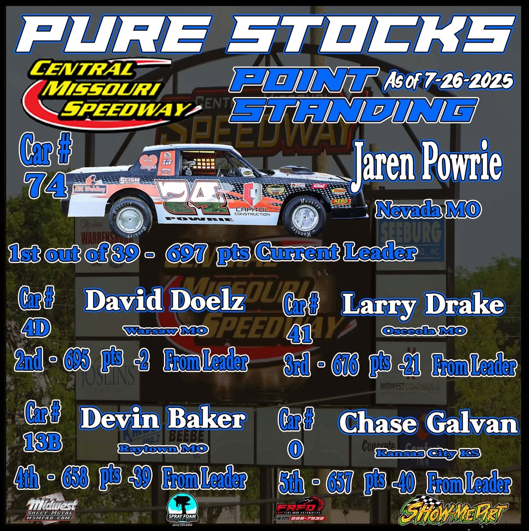 Home UncategorizedCentral Missouri Speedway Pure Stocks Full Points Standings As of 7-26-2025 Tota…
