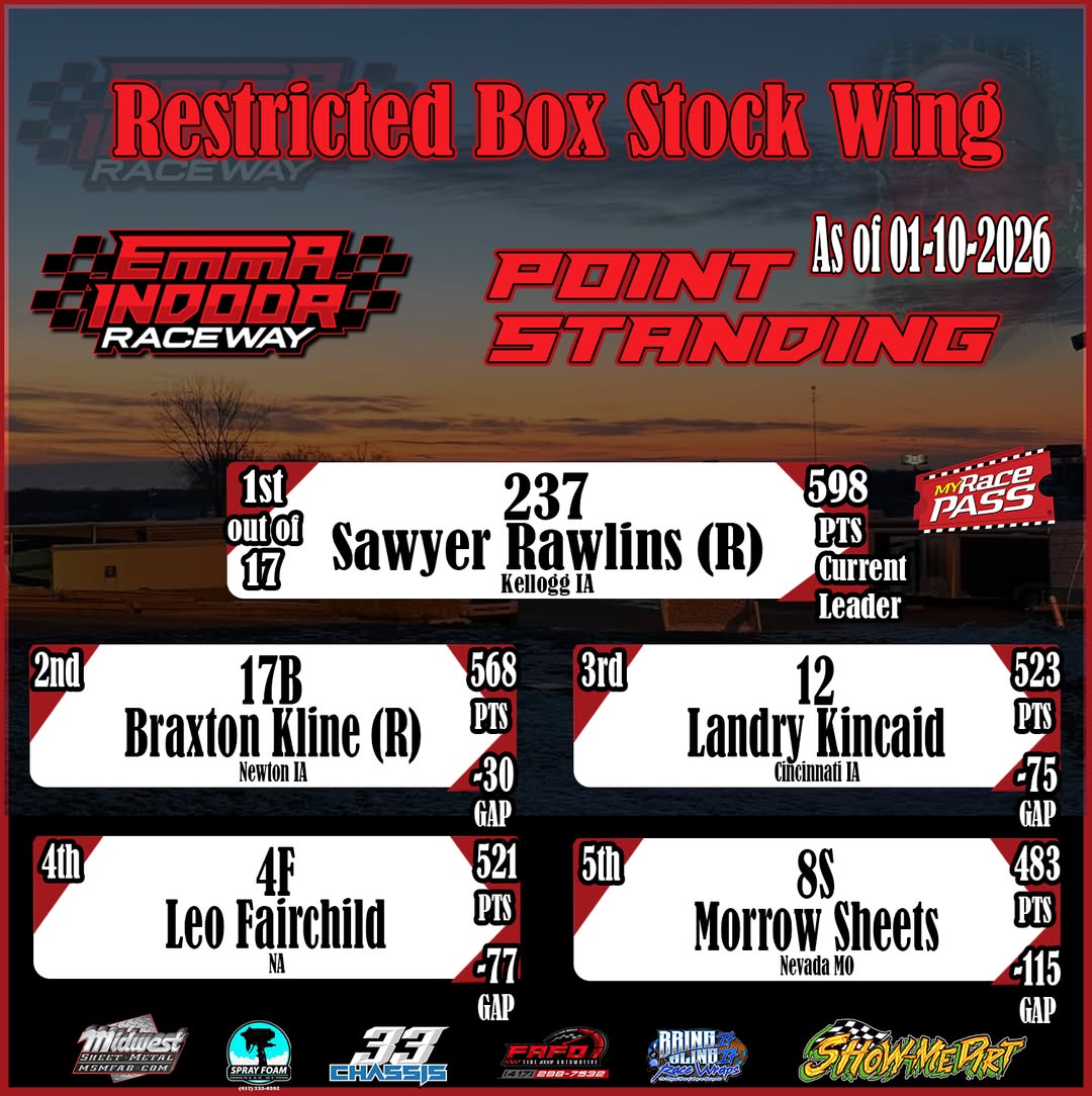 Emma Indoor Raceway Restricted Box Stock Wing Full Points Standings As of 8-29-2…