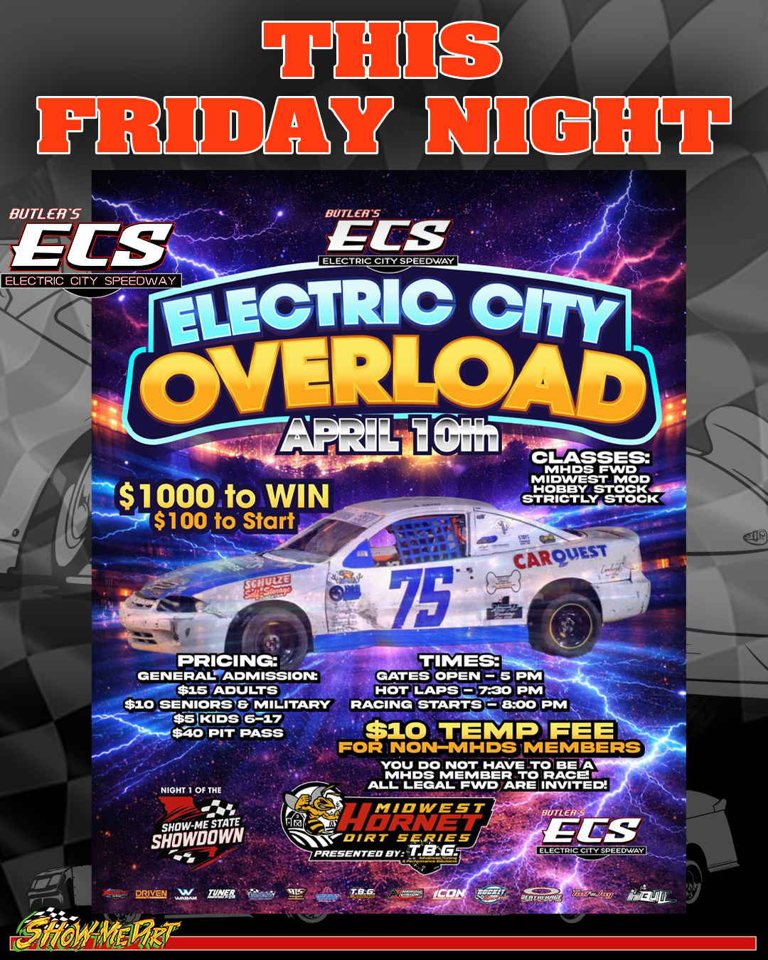 They’ve got a BIG one lined up β the Midwest Hornet Dirt Series is rolling into the fast 1/3 mile, and they’re bringing the heat. Last count shows 50+ drivers from across the country signed up, so expect some wild, door-to-door action in that class all night long.