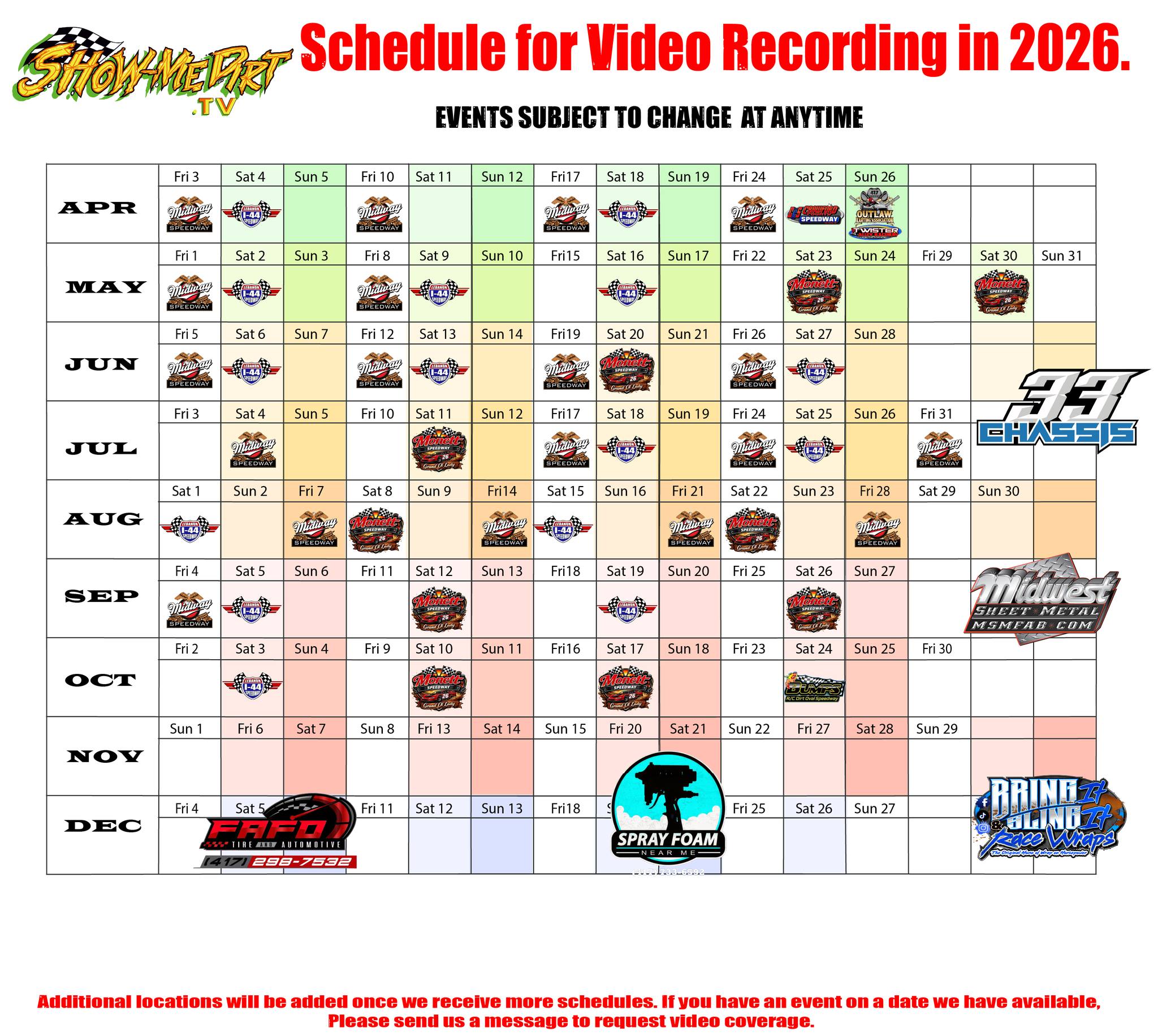 Here is our current schedule! We’re still working on filling in a few more dates with tracks that have granted us video access, so an updated version will be coming soon. If you have an open date and would like us at your event, send us a message, and let’s get it added!