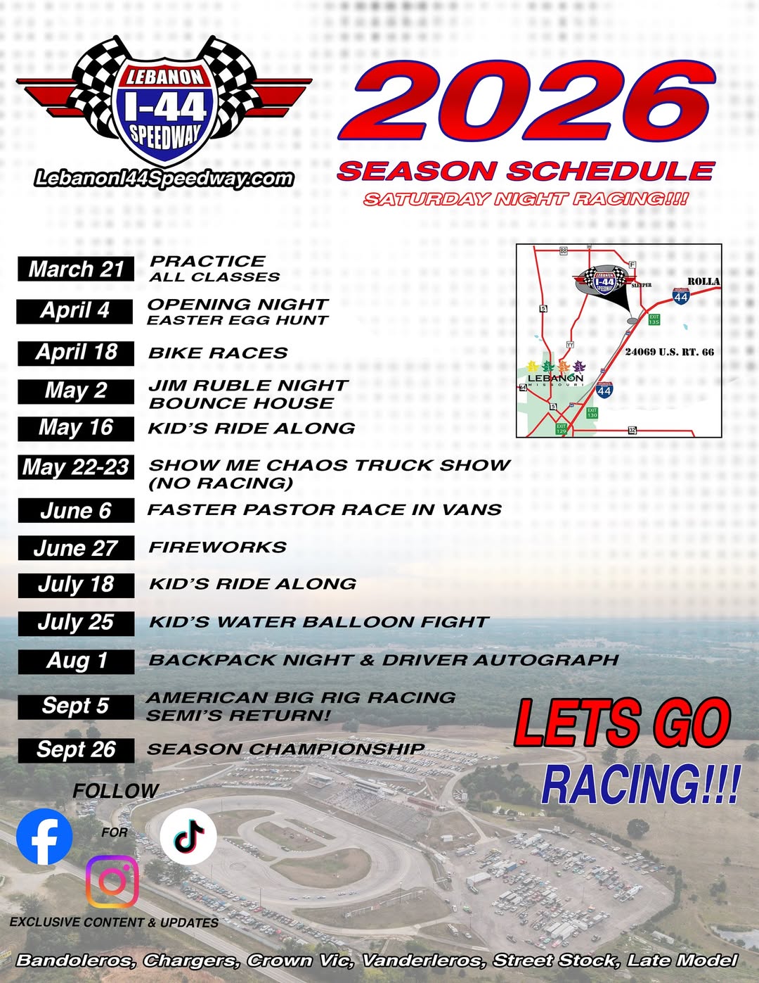 Uncategorized Lebanon I-44 Speedway 2026 Season Schedule is out. by Show-Me Dirt December 31, 2025 written by Show-Me Dirt December 31, 2025 8 Lebanon I-44 Speedway 2026 Season Schedule is out. Source I44LebanonScheduleSeasonSpeedway 0 comments 0 FacebookTwitterPinterestThreadsBlueskyEmail Show-Me Dirt previous post I have had a few people think today was Tally Shaw visitation. It’s next Tuesday… You may also like I have had a few people think today... December 31, 2025 Greenlawn Funeral Home,. Is taking care of my... December 29, 2025 Pre-registration is now OPEN for\nQuads\/Motorcycles Points race #6\nMini... December 28, 2025 Jadyn wrapped up her weekend with two 3rds... December 28, 2025 Hanks back yard kart feature December 27, 2025 Here are my wife Tally’s Service times and... December 27, 2025 Day 2 has been busy!! Jadyn went from... December 27, 2025 Its Driller Time. 3AM Start Time -7.5 hour... December 27, 2025 In loving memory of Thelma ‘Tally’ June Westmoreland... December 27, 2025 Just a reminder we will not be at... December 26, 2025