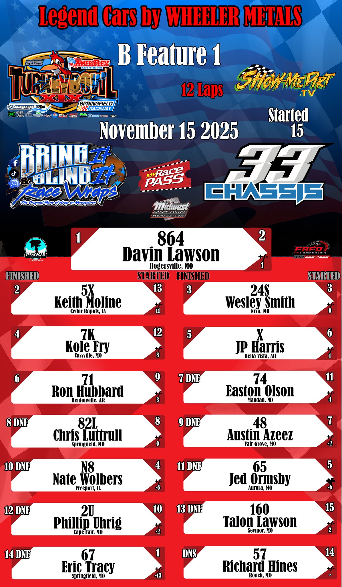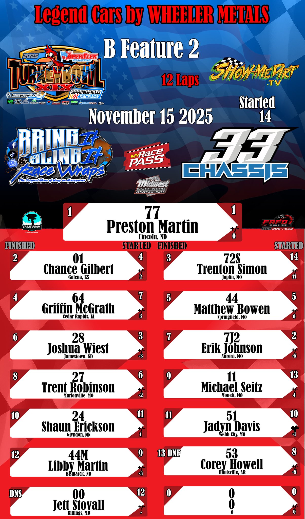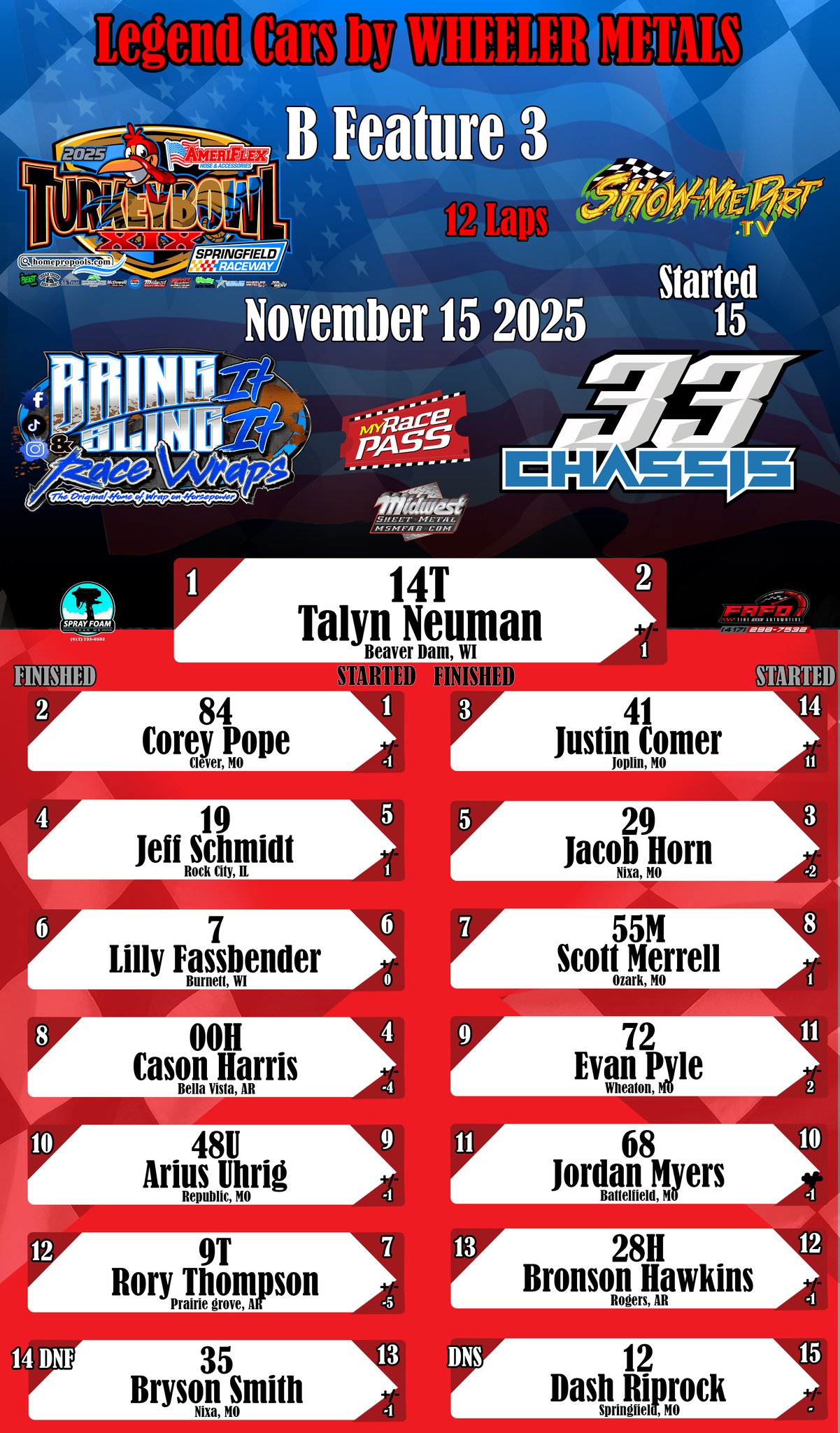#DirtTrackRacing #LocalRacing #RaceResults #MyRacePass #ShowMeDirt #MidwestSheetMetal #SprayFoamNearMe #FAFOTireandAuto #BringItAndSlingIt #WrapOnHorsepower #33Chassis #11152025 #SpringfieldRacewayonMyRacePass #LegendCarsbyWHEELERMETALS