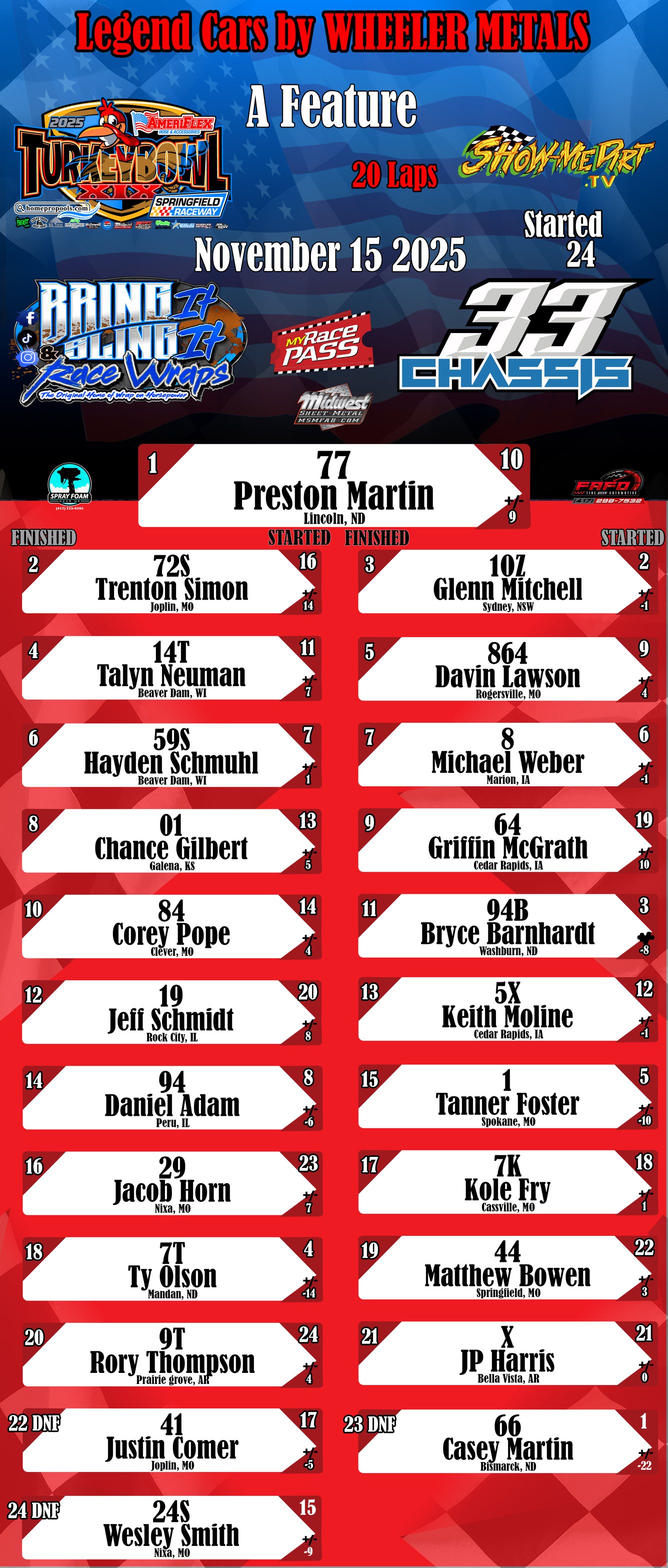#DirtTrackRacing #LocalRacing #RaceResults #MyRacePass #ShowMeDirt #MidwestSheetMetal #SprayFoamNearMe #FAFOTireandAuto #BringItAndSlingIt #WrapOnHorsepower #33Chassis #11152025 #SpringfieldRacewayonMyRacePass #LegendCarsbyWHEELERMETALS