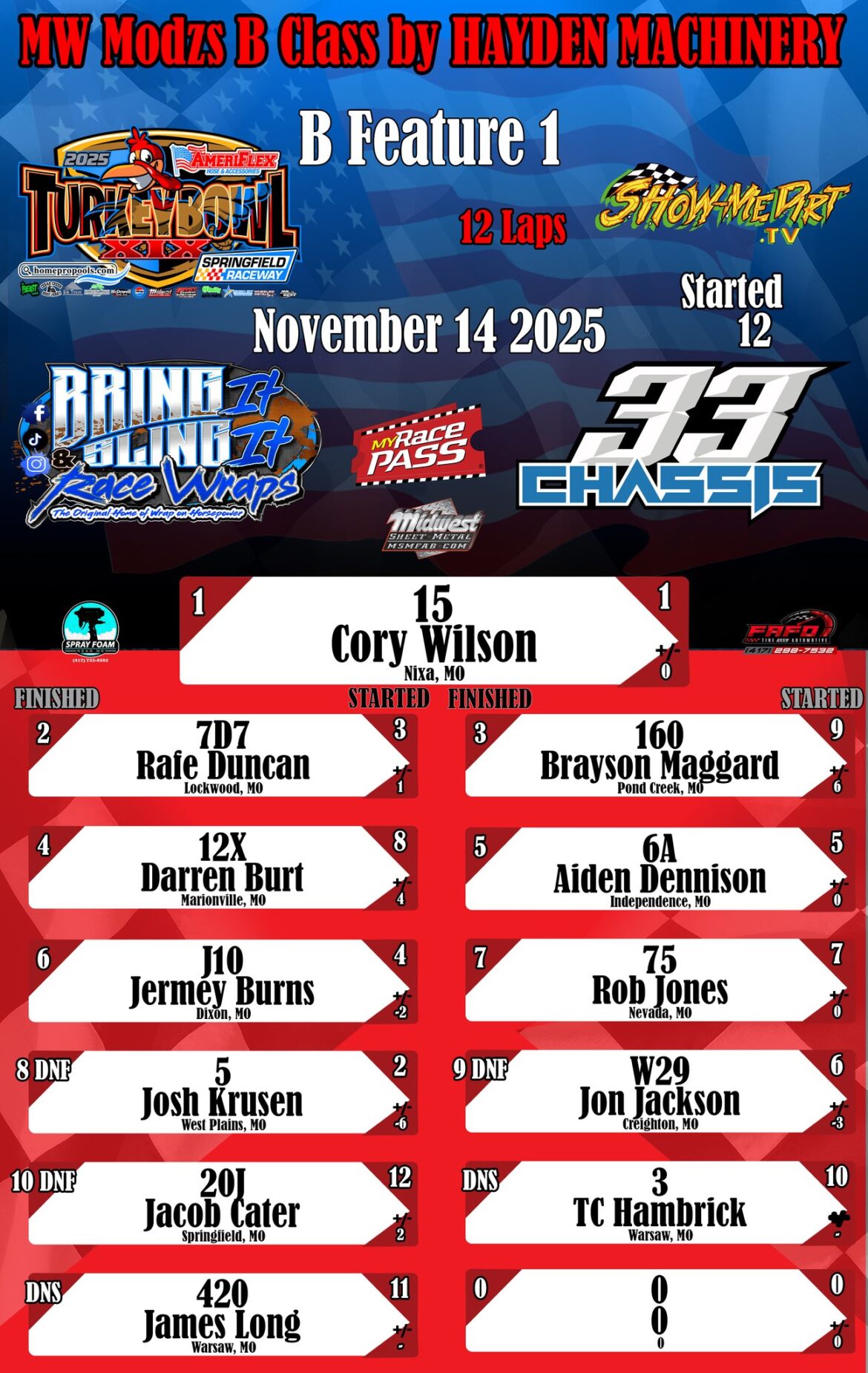 #DirtTrackRacing #LocalRacing #RaceResults #MyRacePass #ShowMeDirt #MidwestSheetMetal #SprayFoamNearMe #FAFOTireandAuto #BringItAndSlingIt #WrapOnHorsepower #33Chassis #11142025 #SpringfieldRacewayonMyRacePass #MWModzsBClassbyHAYDENMACHINERY