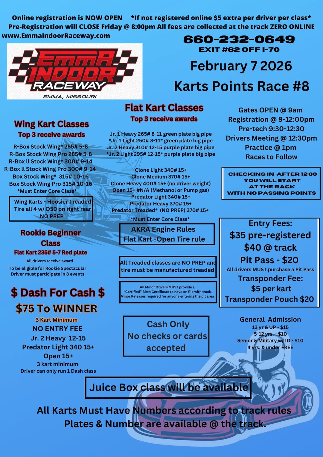 Uncategorized Pre-registration is now OPEN for Karts Points Race #8 by Show-Me Dirt February 1, 2026 written by Show-Me Dirt February 1, 2026 13 Pre-registration is now OPEN for Karts Points Race #8 https://www.myracepass.com/tracks/3807/registrations/ Source kartsopenpointsPreregistrationRace 0 comments 0 FacebookTwitterPinterestThreadsBlueskyEmail Show-Me Dirt previous post Monett Motor Speedway is ready to take us into the 2026 season. next post Ozarks Area Racers Foundation 2026 Scholarship Awards | Ben Chapman & Jaden Davi… You may also like The Twister Alley Raceway 2026 racing Schedule. Get... February 2, 2026 Here is the tentative 2026 schedule, additional details... February 2, 2026 If you are a family member of an... February 1, 2026 Nick Bradshaw Perseverance Award | Racing Legend With... February 1, 2026 Did anyone capture a photo of the @Legit... February 1, 2026 Monett Motor Speedway is ready to take us... February 1, 2026 Show-Me Dirt added photos to the album: Photos... February 1, 2026 2026 class for the 38th annual Ozarks Area... January 31, 2026 Come be part of the Ozarks Area Racers... January 31, 2026 Let Bring It & Sling It Race Wraps... January 31, 2026