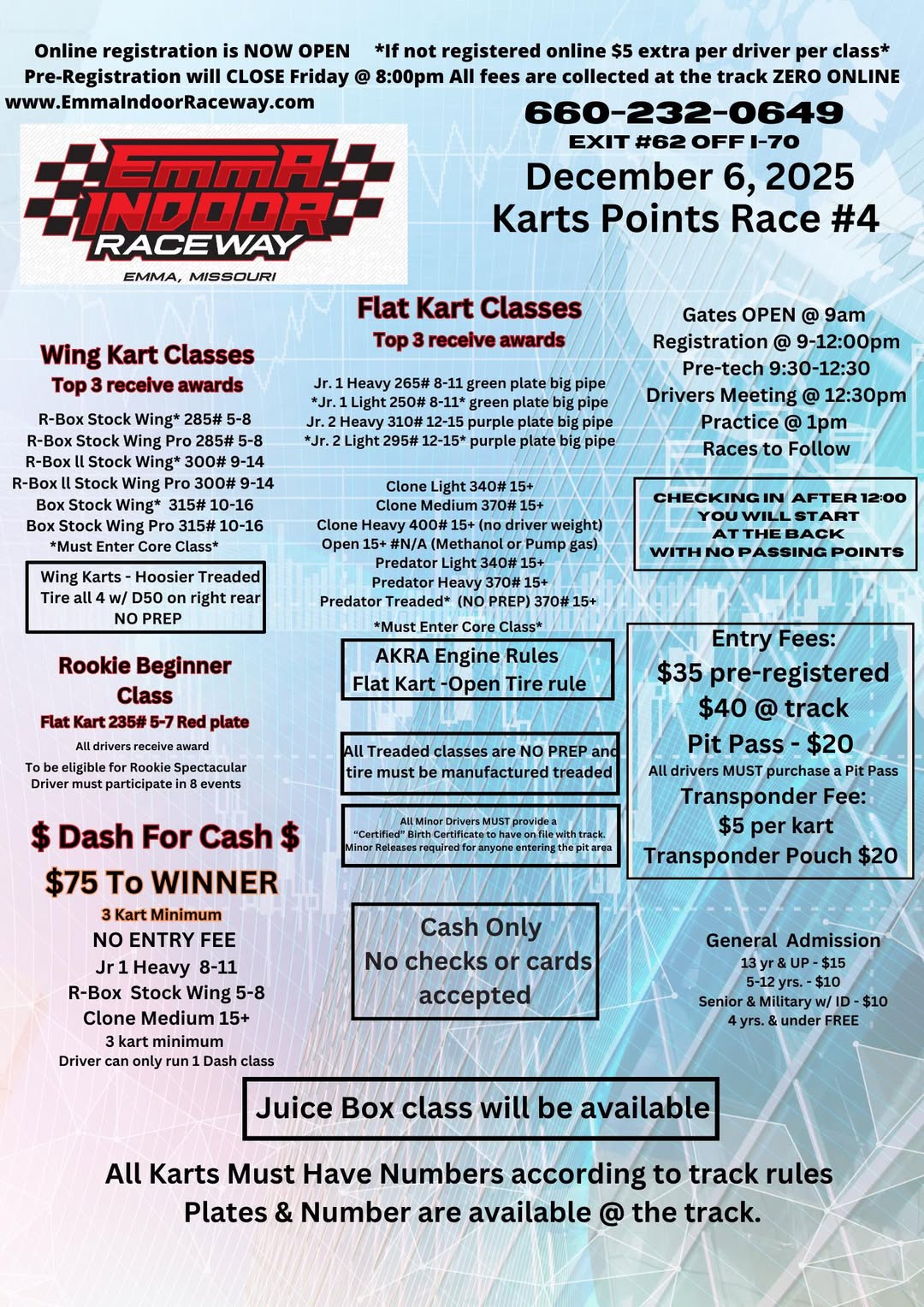 Uncategorized Pre-Registration is now Open for Karts Points Race #4 by Show-Me Dirt November 30, 2025 written by Show-Me Dirt November 30, 2025 5 Pre-Registration is now Open for Karts Points Race #4 https://www.myracepass.com/tracks/3807/registrations/ Source forKartsopenpointsPreregistrationRace 0 comments 0 FacebookTwitterPinterestThreadsBlueskyEmail Show-Me Dirt previous post We want to wish the Promoter from Twister Alley a very Happy Birthday! If you se… next post Hold Up Hold Up Hold Up! Emma Indoor Raceway You may also like Heres Lacy’s album from Emma Indoor Raceway December 1, 2025 CONFIRMED DRIVER ALERT! James Smith is locked in... December 1, 2025 CONFIRMED DRIVER ALERT! Kyndell “Jelly-Bean” Abt of Paperboy... December 1, 2025 Hold Up Hold Up Hold Up! Emma Indoor... November 30, 2025 THIS WEEK’S REPLAY REEL 1 of 2! From... November 30, 2025 Juice Box 11/29/25 Sunday morning video We had... November 30, 2025 Another Photo finish at the Emma Indoor Raceway... November 30, 2025 Good morning It’s been a hectic few months... November 30, 2025 HEAT RACE RESULTS 11/29/2025 – Emma Indoor Raceway... November 30, 2025 Thanks for being a top engager and making... November 30, 2025