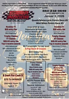 Pre-registration is now OPEN fornQuads/Motorcycles Points race #6nMini Bikes Points Race #3 nnhttps://www.myracepass.com/tracks/3807/registrations/nnReminder: This is the first race of 2026 so new minor releases will be needed. To speed up the process you can download a copy of the release, fill it out and bring it with you. If the minoru2019s parents will not be at registration, they will need to do the Notary Minor Release. nNew cards will be issued.”,”ranges”:[{“offset”:94,”length”:53,”entity”:{“__typename”:”ExternalUrl”,”__isEntity”:”ExternalUrl”,”mobileUrl”:”https://lm.facebook.com/l.php?u=httpsu00253Au00252Fu00252Fwww.myracepass.comu00252Ftracksu00252F3807u00252Fregistrationsu00252F&h=AT2PIYJ1K6fSDNLpuRfpbvJGacpPCPwpUhcZ1R-j_HLyPIGESXgxxu8hZ2BmlgkM7Zuqi15RXp-KwqzBn0xcqn84HPgcfoBt-JlIVfJAj_K_zF0FQOnL5wBLQN9uSdYSYdSgnyYvzjn5bqC2bUHcTodREkpJnktj9PhPKw&s=1″,”url”:”https://l.facebook.com/l.php?u=httpsu00253Au00252Fu00252Fwww.myracepass.comu00252Ftracksu00252F3807u00252Fregistrationsu00252F&h=AT3wXHom_pSyfPma7jHoZPOBipmcwBXoV91OcBoSGb1Xlo1pZehrVEQ9h8k_BtODe8KzxBJI_574tYmFCPiHl484ZyjJlHcS_tjuPQ60ecJfuXSVvKKNLqKkjjMUFWc3KWg5vG2pPDd4Qtj5N8RIbIK0uudKmUR1MzV-6g&s=1″,”external_url”:”https://www.myracepass.com/tracks/3807/registrations/”,”__isNode”:”ExternalUrl”,”id”:”NjQyMTgzOTU5MjA4MTA3Omh0dHBzXGEvL3d3dy5teXJhY2VwYXNzLmNvbS90cmFja3MvMzgwNy9yZWdpc3RyYXRpb25zLzo6Ojo6OTQwNTM4ODA4MzI4NDE2