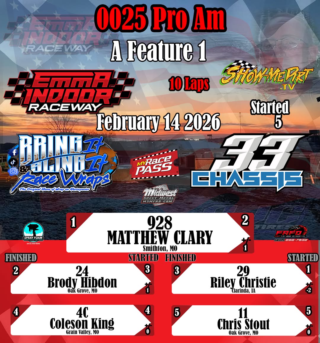 #DirtTrackRacing #LocalRacing #RaceResults #MyRacePass #ShowMeDirt #MidwestSheetMetal #SprayFoamNearMe #FAFOTireandAuto #BringItAndSlingIt #WrapOnHorsepower #33Chassis #2142026 #EmmaIndoorRacewayonMyRacePass #0025ProAm