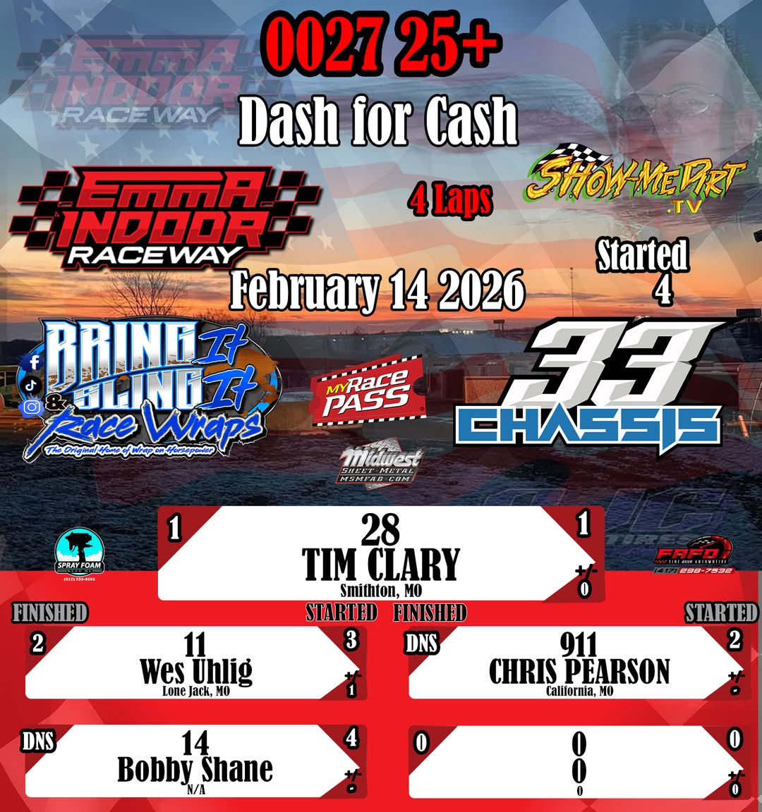 #DirtTrackRacing #LocalRacing #RaceResults #MyRacePass #ShowMeDirt #MidwestSheetMetal #SprayFoamNearMe #FAFOTireandAuto #BringItAndSlingIt #WrapOnHorsepower #33Chassis #2142026 #EmmaIndoorRacewayonMyRacePass #002725