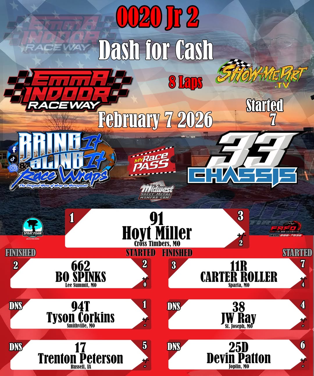 #DirtTrackRacing #LocalRacing #RaceResults #MyRacePass #ShowMeDirt #MidwestSheetMetal #SprayFoamNearMe #FAFOTireandAuto #BringItAndSlingIt #WrapOnHorsepower #33Chassis #2072026 #EmmaIndoorRacewayonMyRacePass #0020Jr2