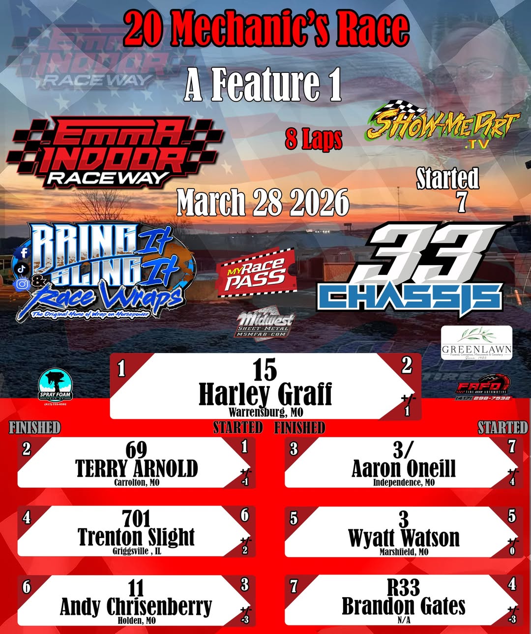 #DirtTrackRacing #LocalRacing #RaceResults #MyRacePass #ShowMeDirt #MidwestSheetMetal #SprayFoamNearMe #FAFOTireandAuto #BringItAndSlingIt #WrapOnHorsepower #33Chassis #3282026 #EmmaIndoorRacewayonMyRacePass #0020MechanicsRace