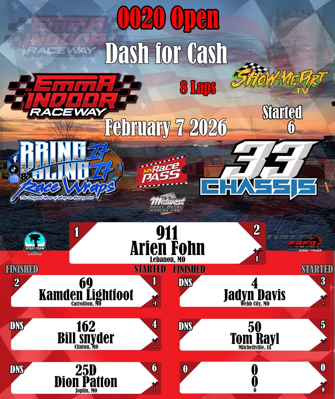 #DirtTrackRacing #LocalRacing #RaceResults #MyRacePass #ShowMeDirt #MidwestSheetMetal #SprayFoamNearMe #FAFOTireandAuto #BringItAndSlingIt #WrapOnHorsepower #33Chassis #2072026 #EmmaIndoorRacewayonMyRacePass #0020Open
