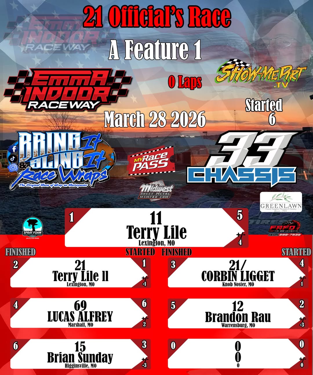 #DirtTrackRacing #LocalRacing #RaceResults #MyRacePass #ShowMeDirt #MidwestSheetMetal #SprayFoamNearMe #FAFOTireandAuto #BringItAndSlingIt #WrapOnHorsepower #33Chassis #3282026 #EmmaIndoorRacewayonMyRacePass #0021OfficialsRace