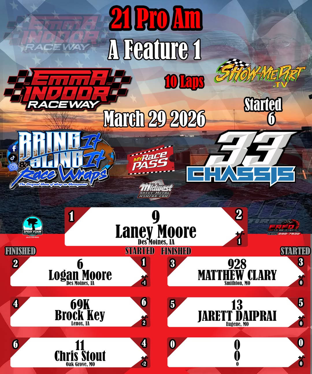#DirtTrackRacing #LocalRacing #RaceResults #MyRacePass #ShowMeDirt #MidwestSheetMetal #SprayFoamNearMe #FAFOTireandAuto #BringItAndSlingIt #WrapOnHorsepower #33Chassis #3292026 #EmmaIndoorRacewayonMyRacePass #0021ProAm
