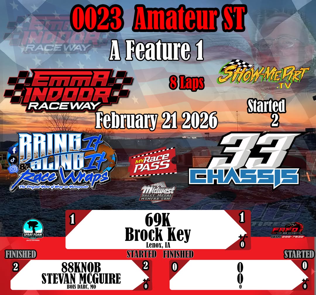 #DirtTrackRacing #LocalRacing #RaceResults #MyRacePass #ShowMeDirt #MidwestSheetMetal #SprayFoamNearMe #FAFOTireandAuto #BringItAndSlingIt #WrapOnHorsepower #33Chassis #2212026 #EmmaIndoorRacewayonMyRacePass #0023AmateurST