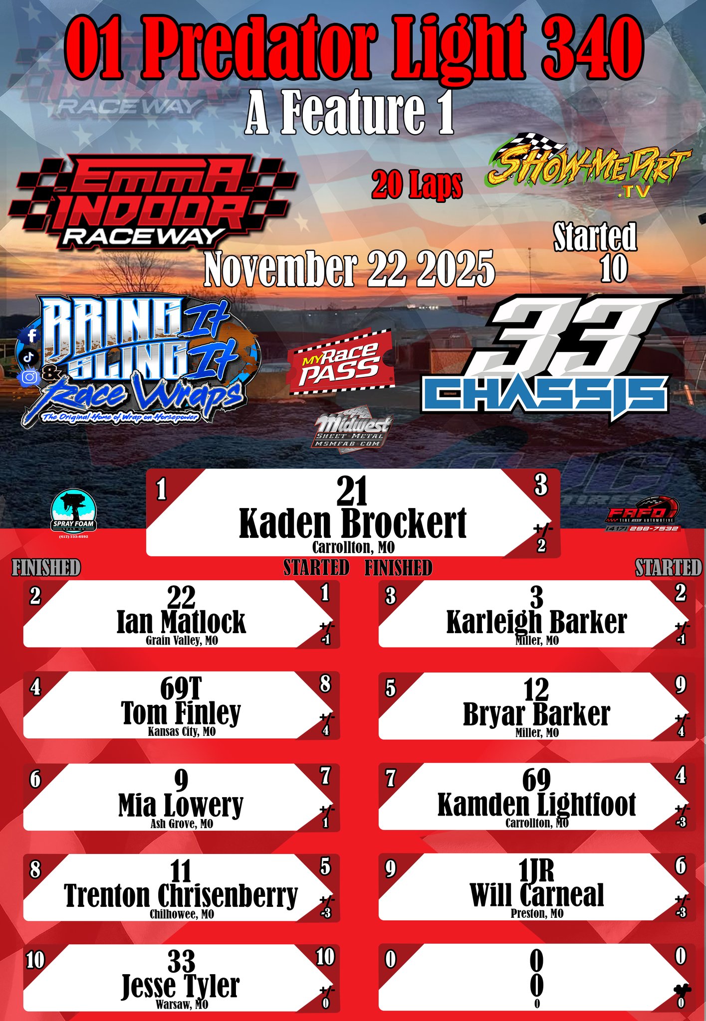 #DirtTrackRacing #LocalRacing #RaceResults #MyRacePass #ShowMeDirt #MidwestSheetMetal #SprayFoamNearMe #FAFOTireandAuto #BringItAndSlingIt #WrapOnHorsepower #33Chassis #11222025 #EmmaIndoorRacewayonMyRacePass #kartracing