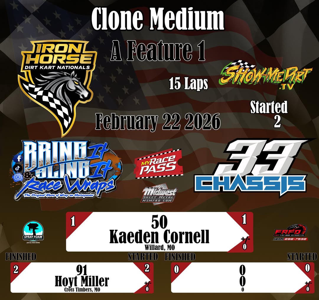 #DirtTrackRacing #LocalRacing #RaceResults #MyRacePass #ShowMeDirt #MidwestSheetMetal #SprayFoamNearMe #FAFOTireandAuto #BringItAndSlingIt #WrapOnHorsepower #33Chassis #2222026 #IronHorseDirtKartNationalsonMyRacePass #CloneMedium