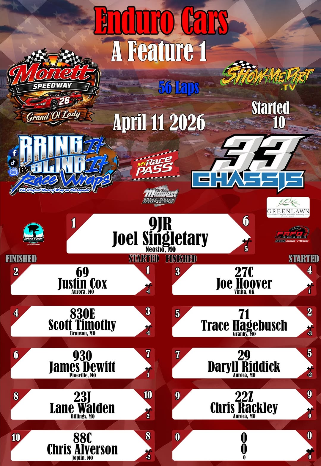 #DirtTrackRacing #LocalRacing #RaceResults #MyRacePass #ShowMeDirt #MidwestSheetMetal #SprayFoamNearMe #FAFOTireandAuto #BringItAndSlingIt #WrapOnHorsepower #33Chassis #4112026 #MonettSpeedwayonMyRacePass #EnduroCars
