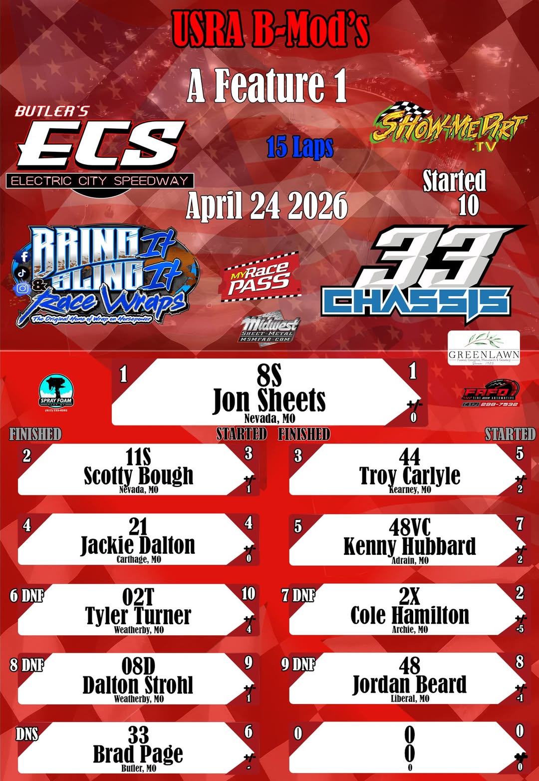 #DirtTrackRacing #LocalRacing #RaceResults #MyRacePass #ShowMeDirt #MidwestSheetMetal #SprayFoamNearMe #FAFOTireandAuto #BringItAndSlingIt #WrapOnHorsepower #33Chassis #4242026 #ElectricCitySpeedwayonMyRacePass #USRABMods