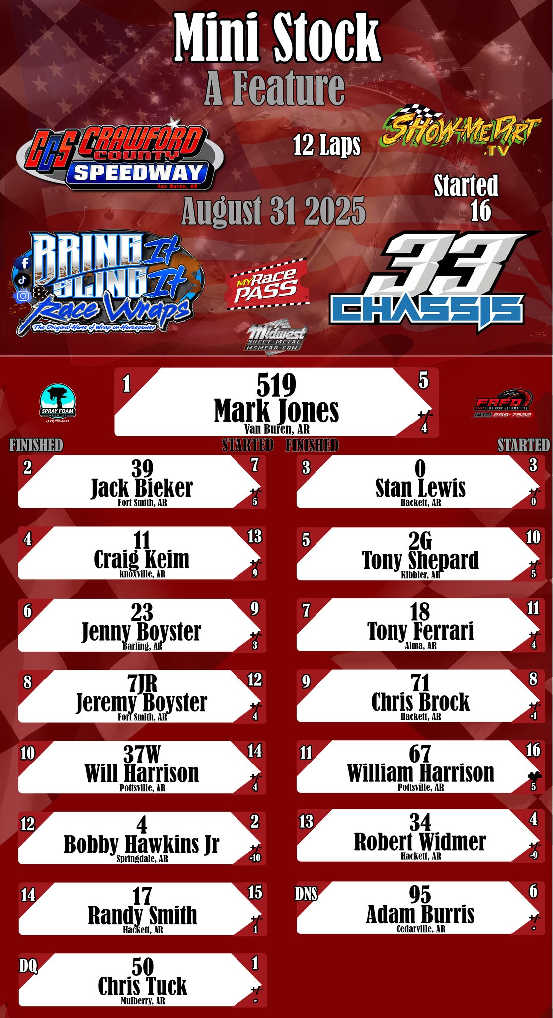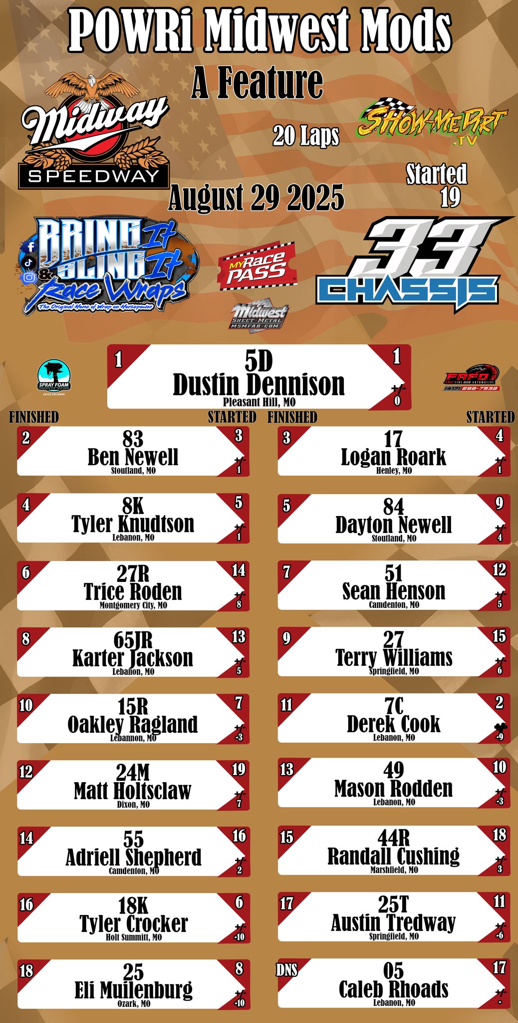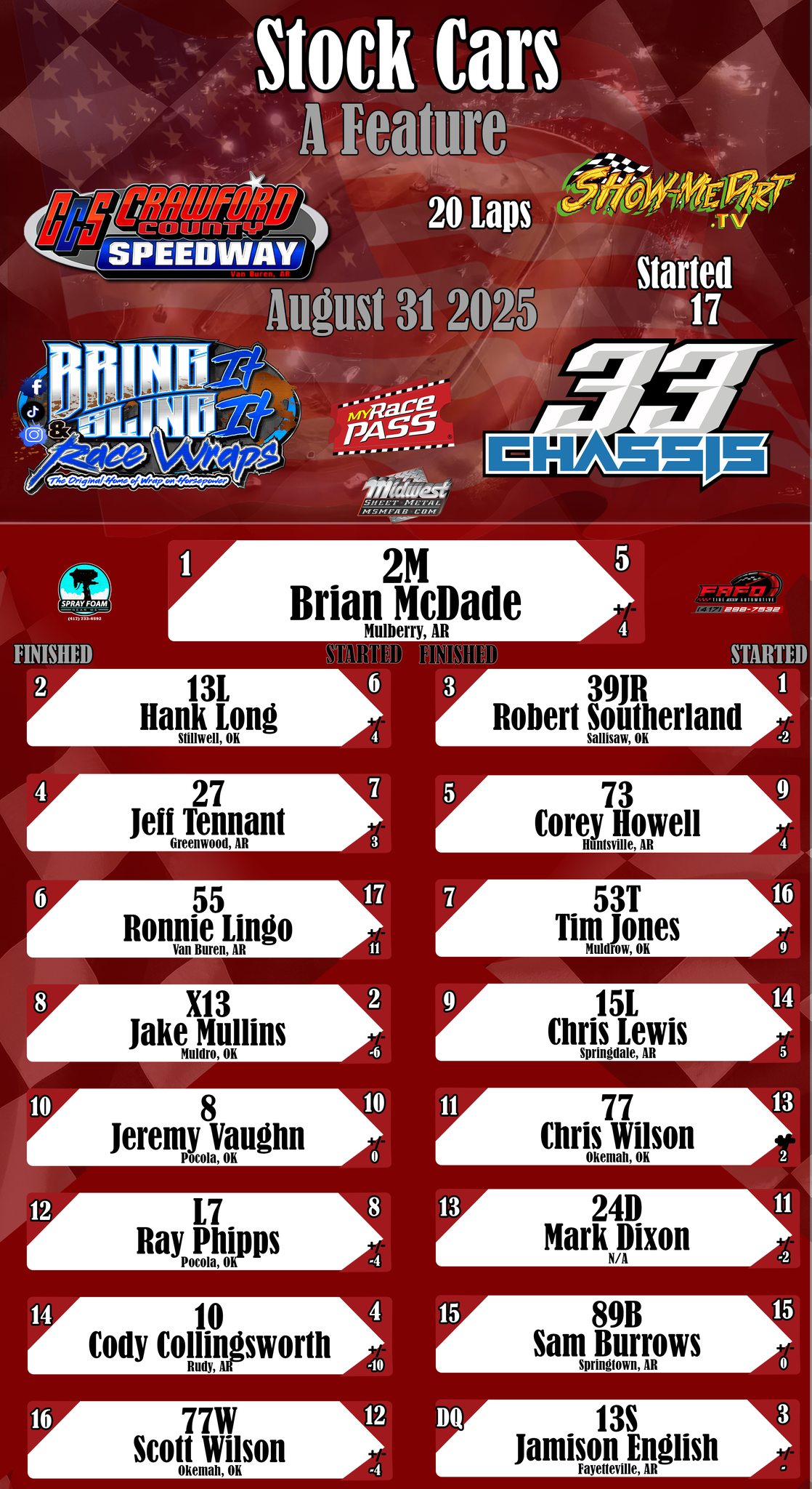 #DirtTrackRacing #LocalRacing #RaceResults #MyRacePass #ShowMeDirt #MidwestSheetMetal #SprayFoamNearMe #FAFOTireandAuto #BringItAndSlingIt #WrapOnHorsepower #8312025CrawfordCountyonMyRacePass #USRABMods