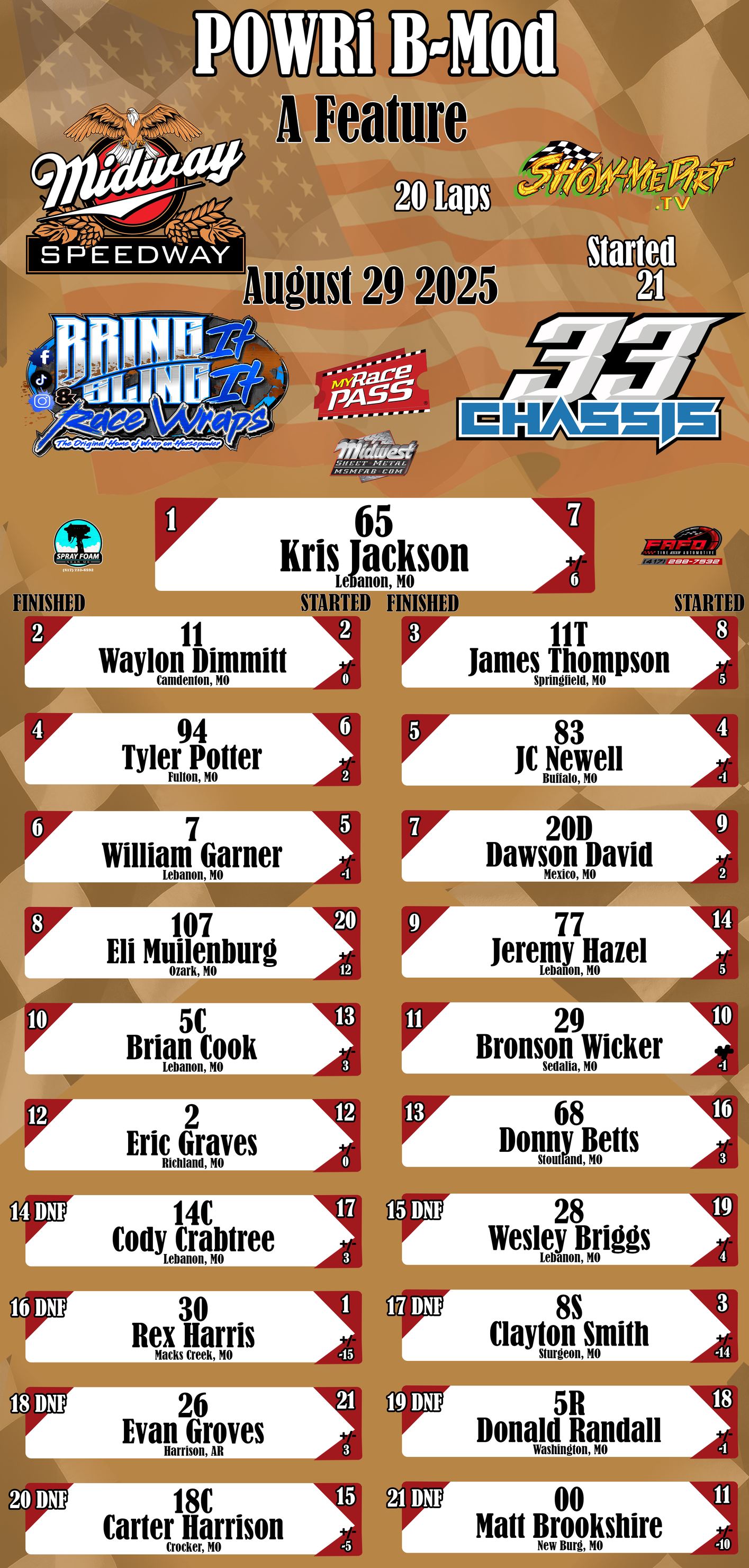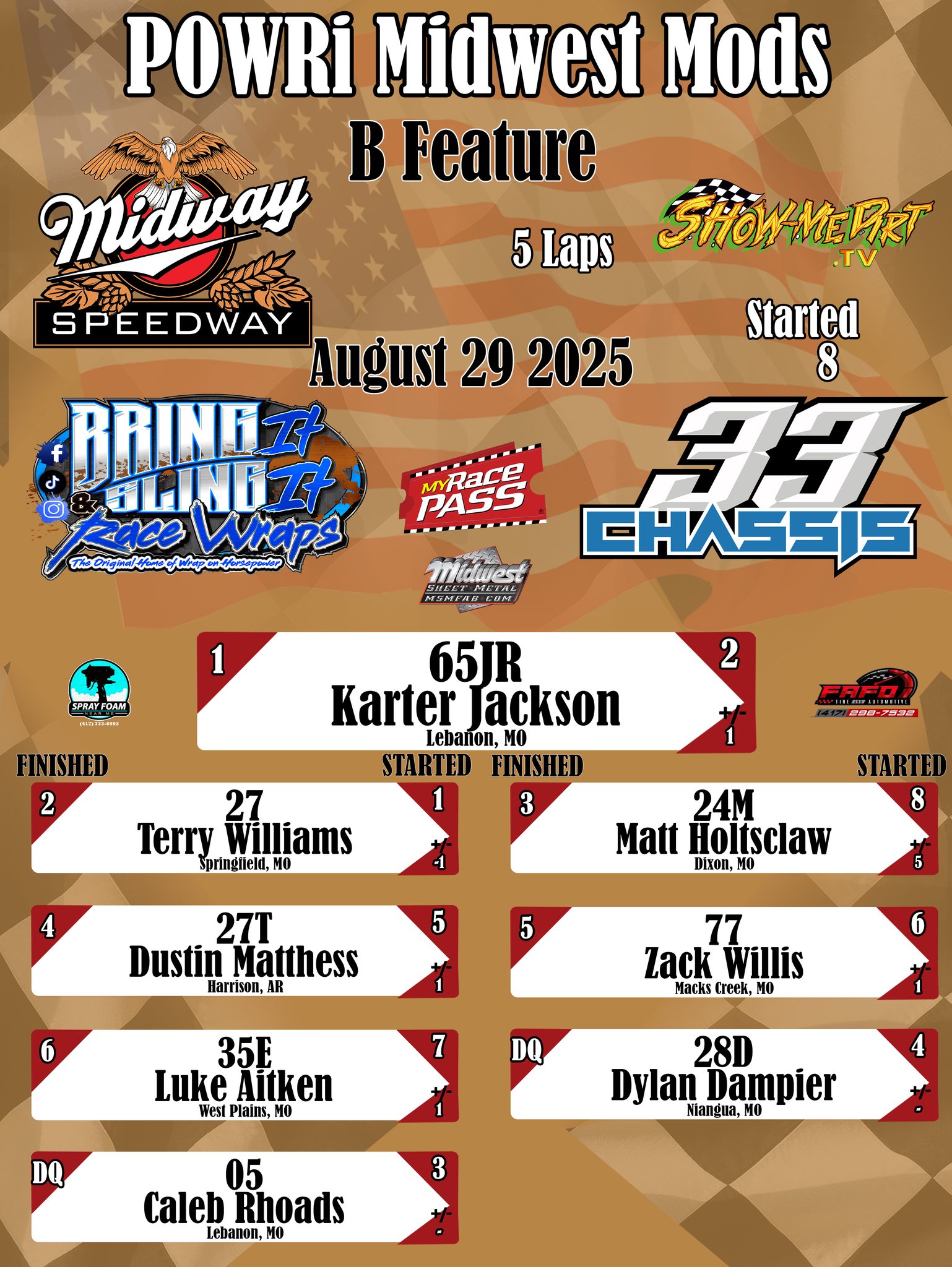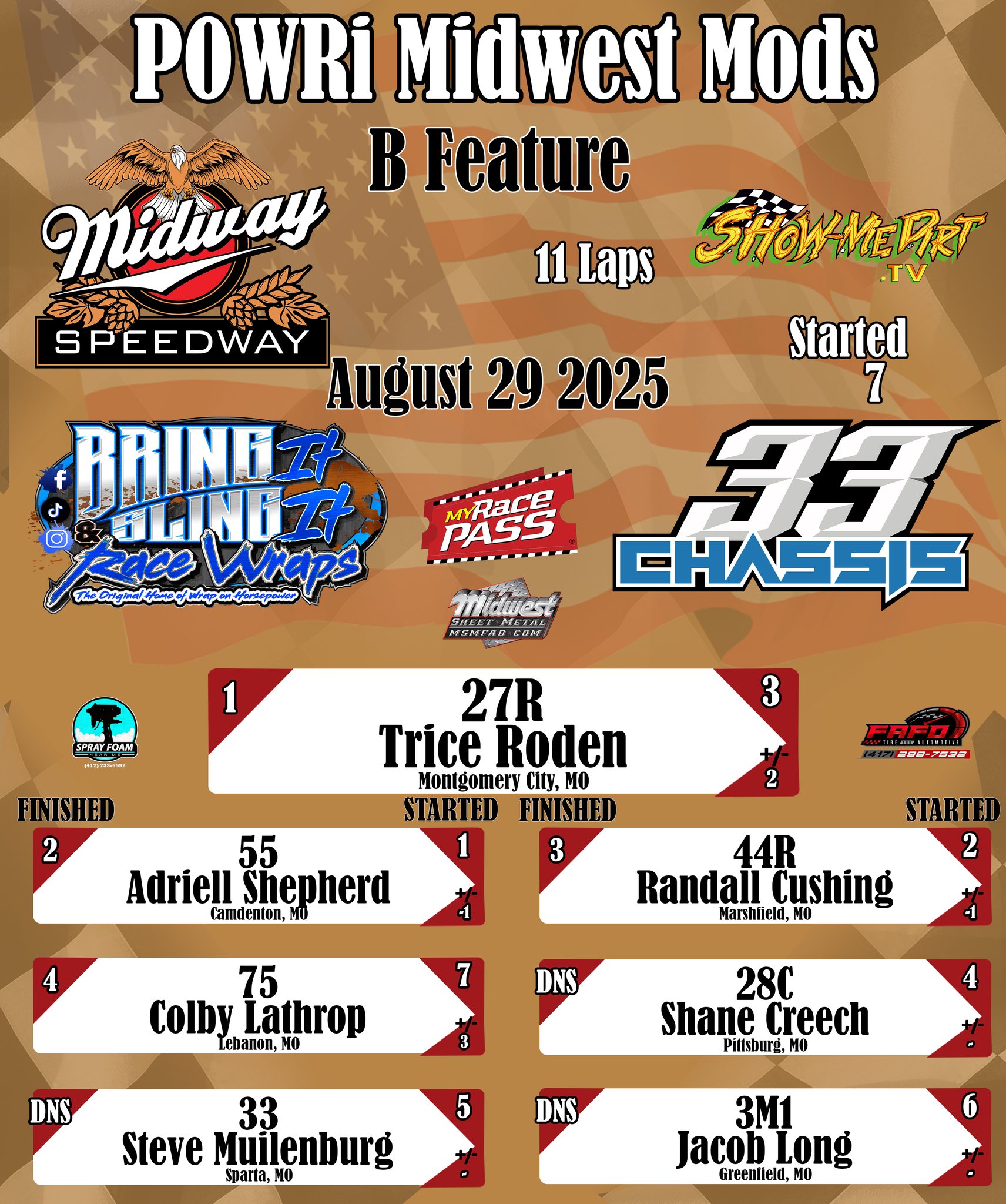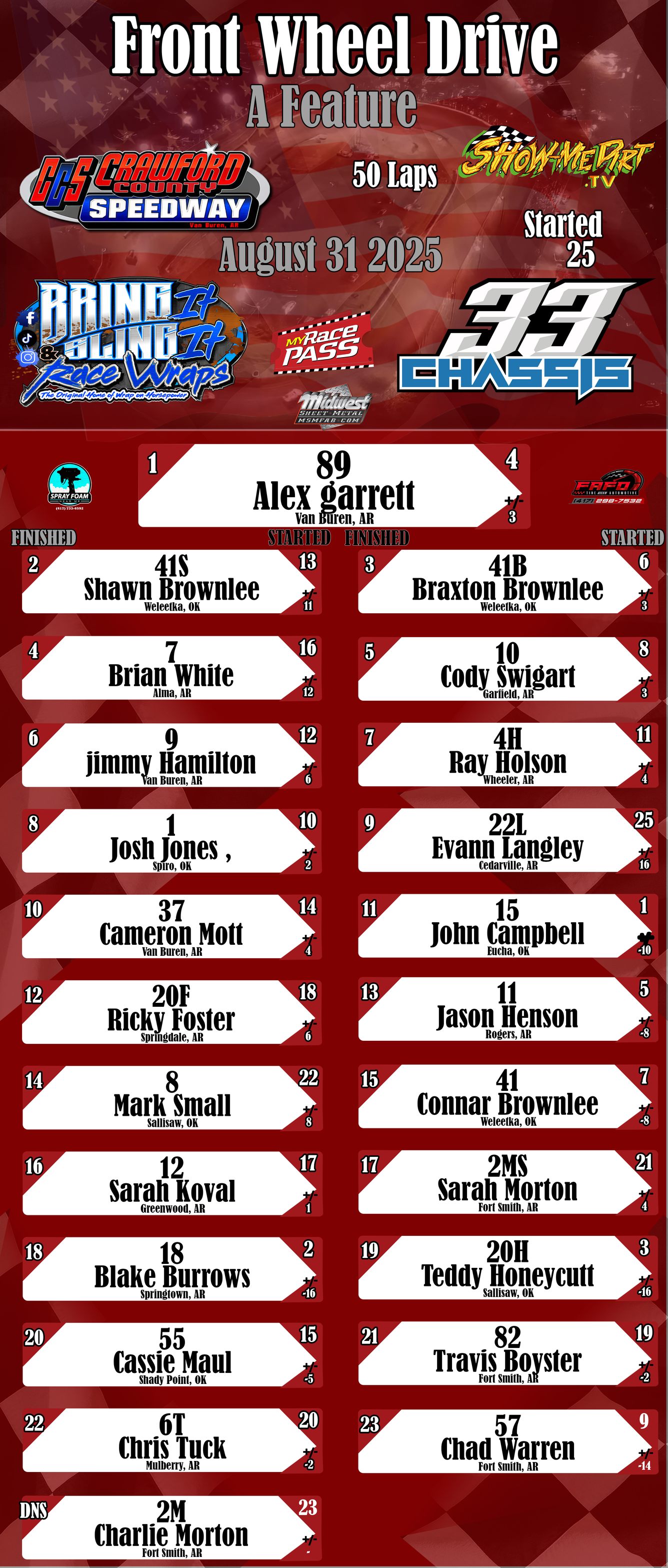 #DirtTrackRacing #LocalRacing #RaceResults #MyRacePass #ShowMeDirt #MidwestSheetMetal #SprayFoamNearMe #FAFOTireandAuto #BringItAndSlingIt #WrapOnHorsepower #8312025CrawfordCountyonMyRacePass #USRABMods