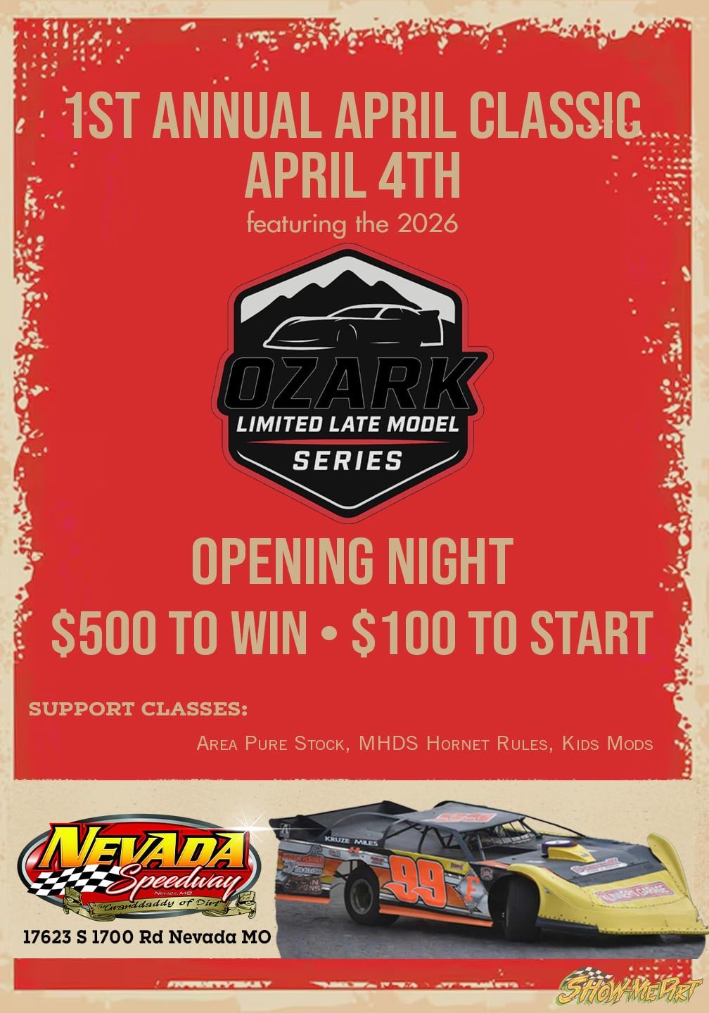 April 4th 2026 is the Ozark Limited Late Model Series season opener at Nevada speedway for the first annual April classic!