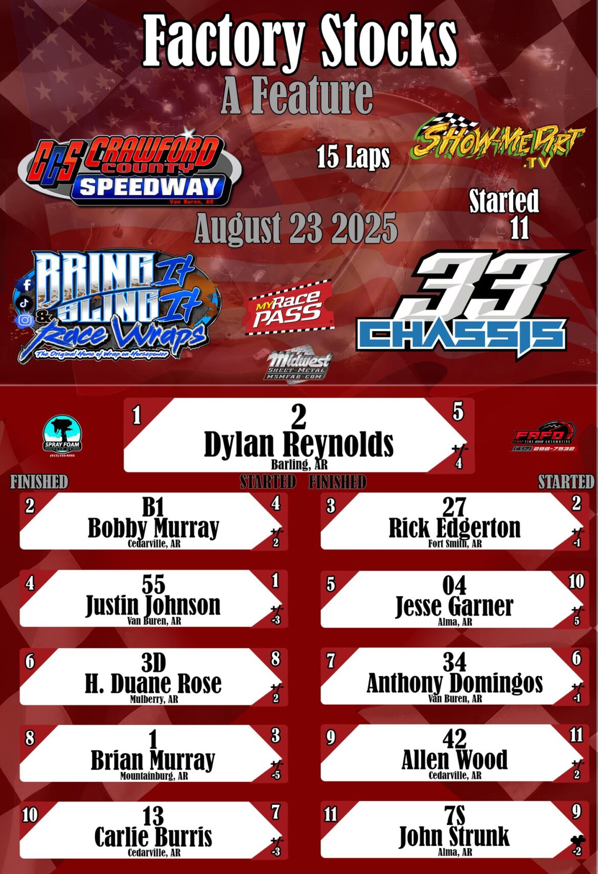 #DirtTrackRacing #LocalRacing #RaceResults #MyRacePass #ShowMeDirt #MidwestSheetMetal #SprayFoamNearMe #FAFOTireandAuto #BringItAndSlingIt #WrapOnHorsepower #8312025CrawfordCountyonMyRacePass #USRABMods