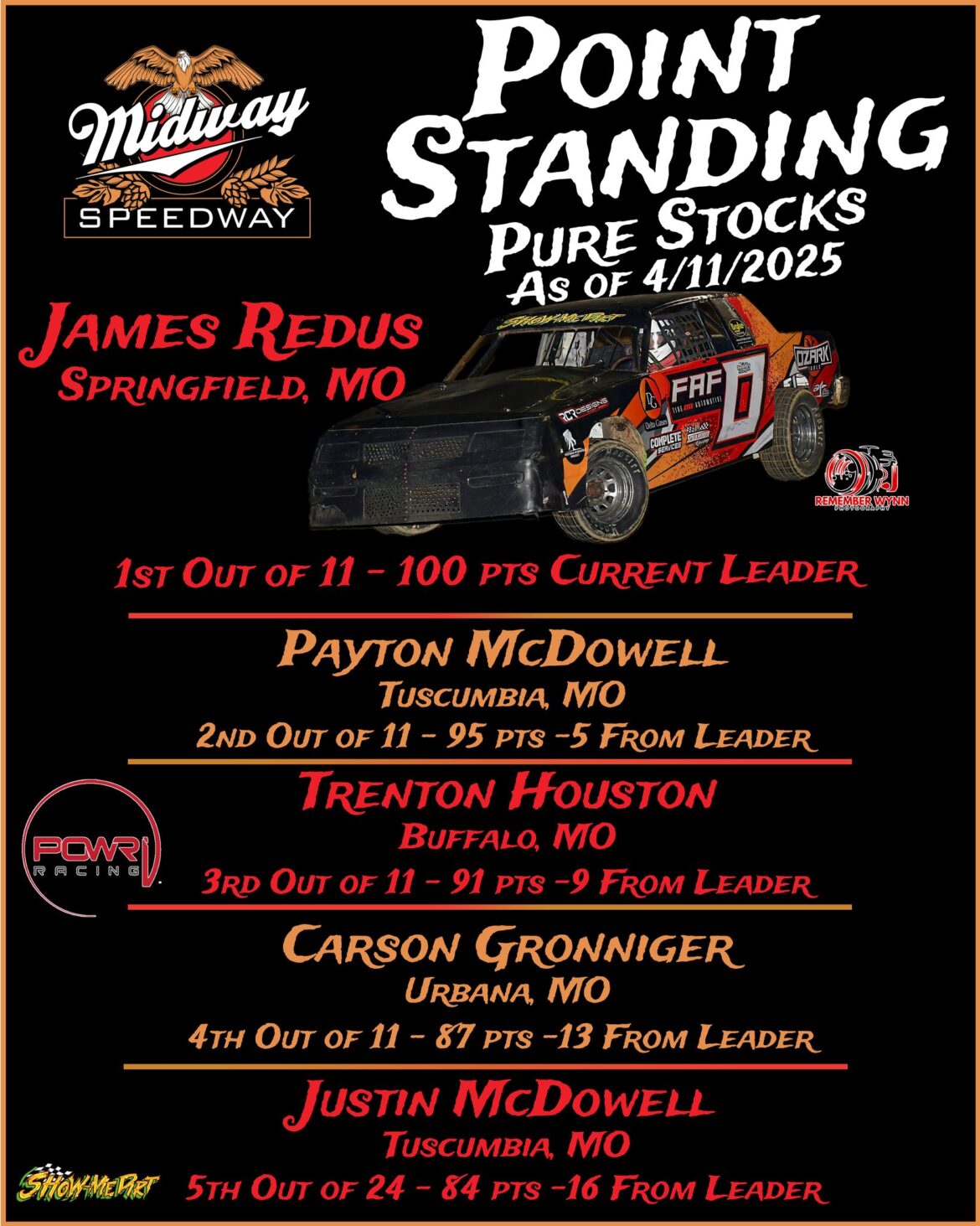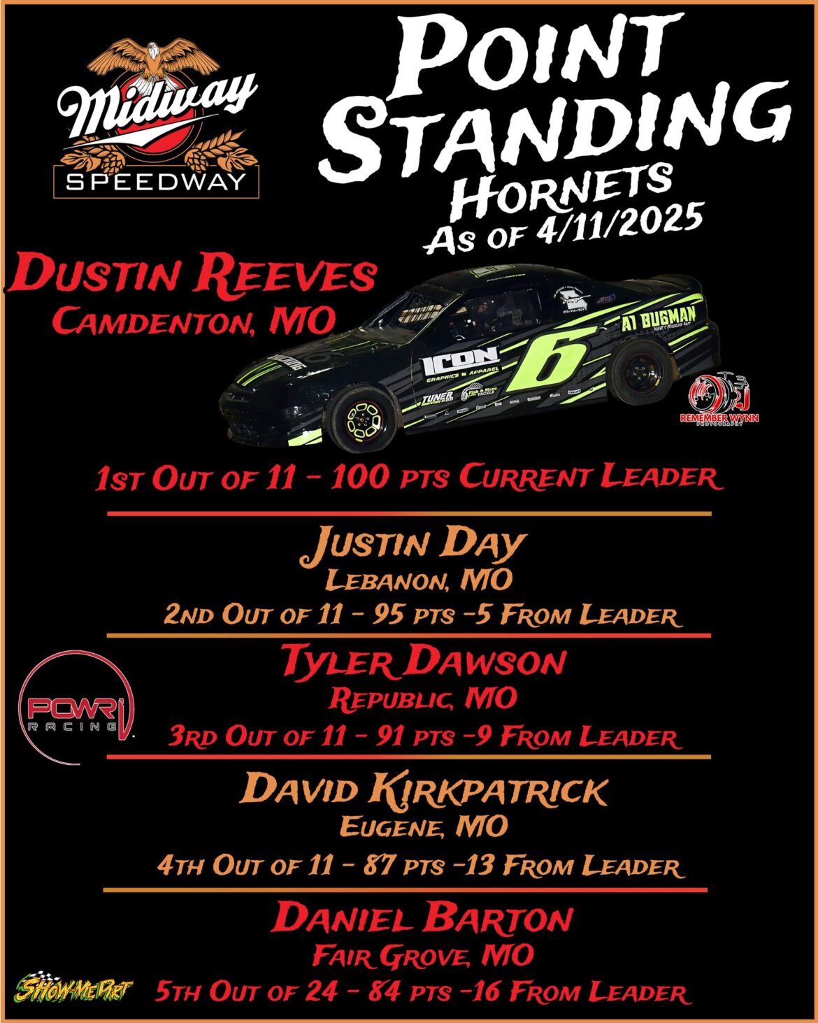 Midweek Update: With Mother Nature prevailing last week, we’re closely monitoring the weather this week as well. There are no new points updates this week, but let’s hope we can hold the races this Friday night.