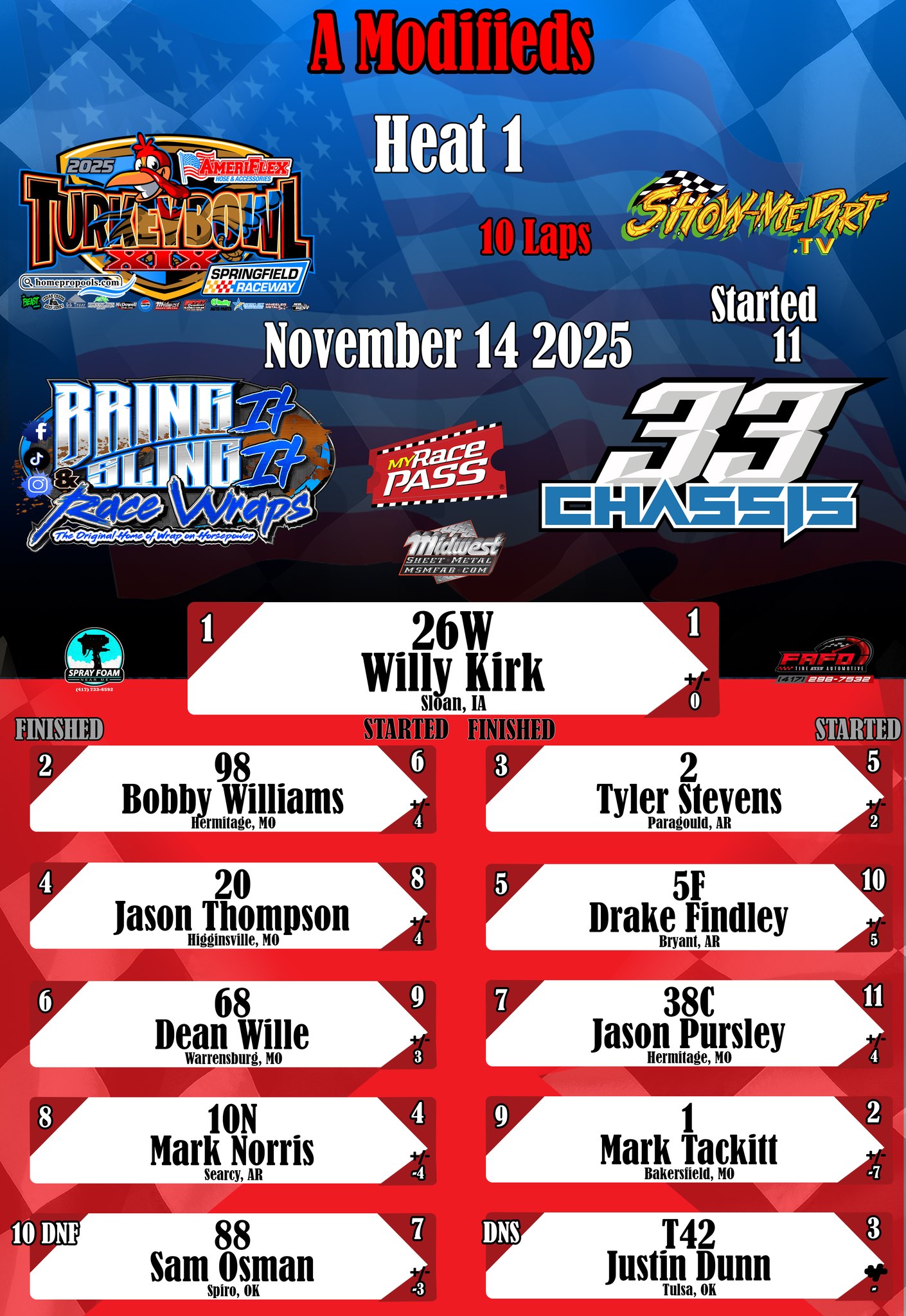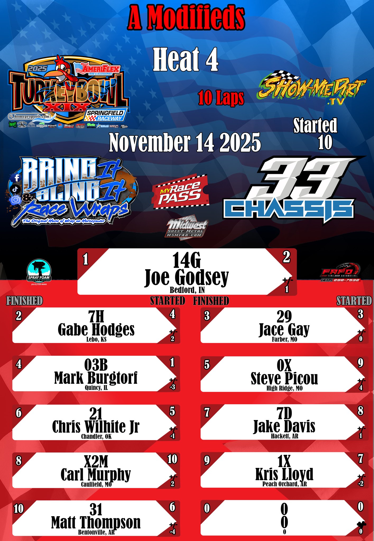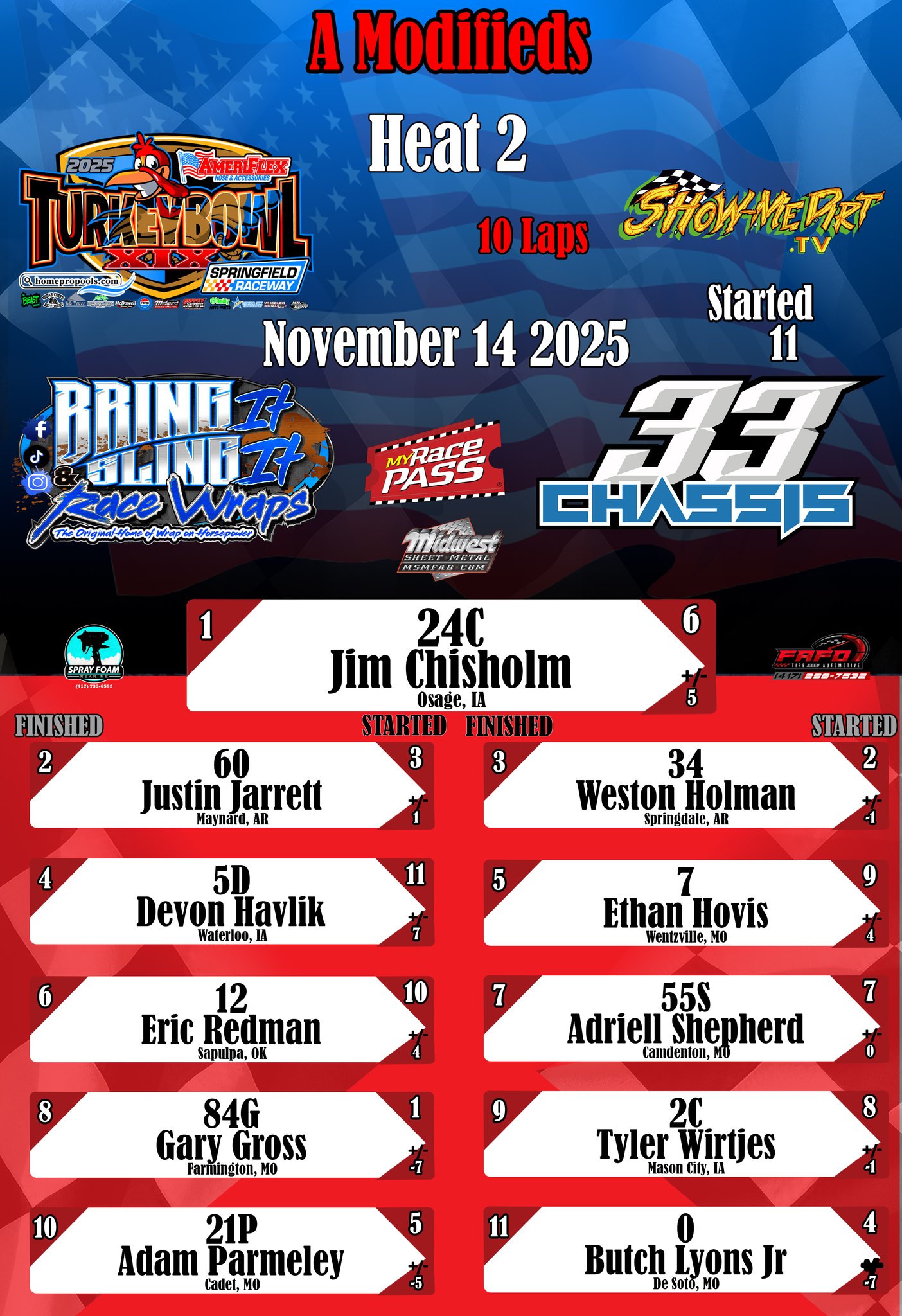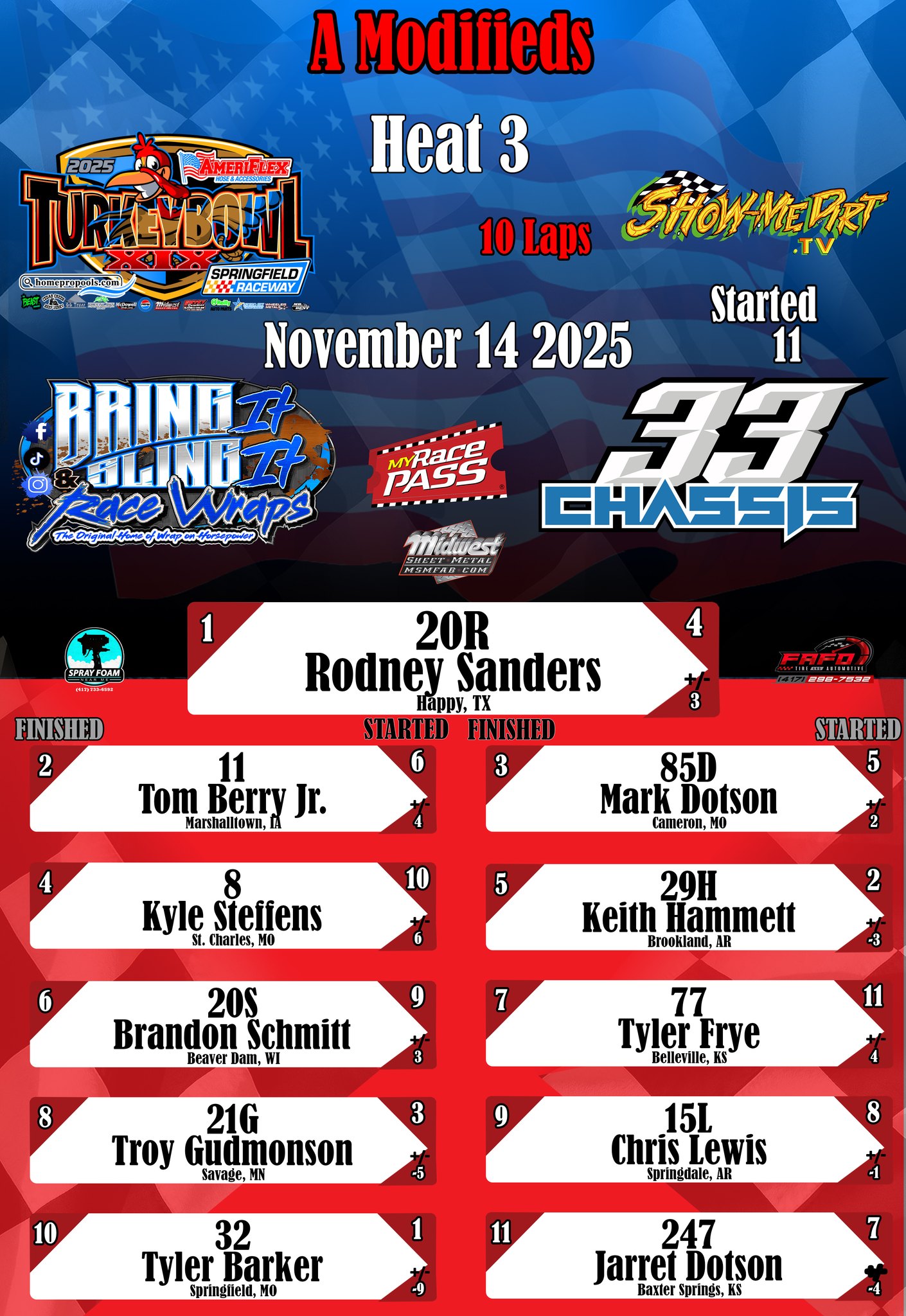 #DirtTrackRacing #LocalRacing #RaceResults #MyRacePass #ShowMeDirt #MidwestSheetMetal #SprayFoamNearMe #FAFOTireandAuto #BringItAndSlingIt #WrapOnHorsepower #33Chassis #11152025 #SpringfieldRacewayonMyRacePass #SuperStocks