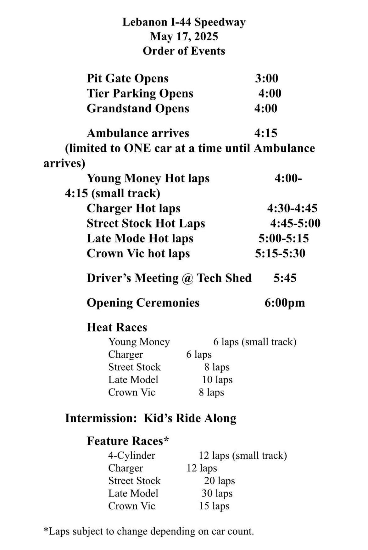 Time: Pit Gates Open at 4pm, Grandstands 5pm, Drivers Meeting 6:42pm Qualifying & Hot Laps 7:02pm
