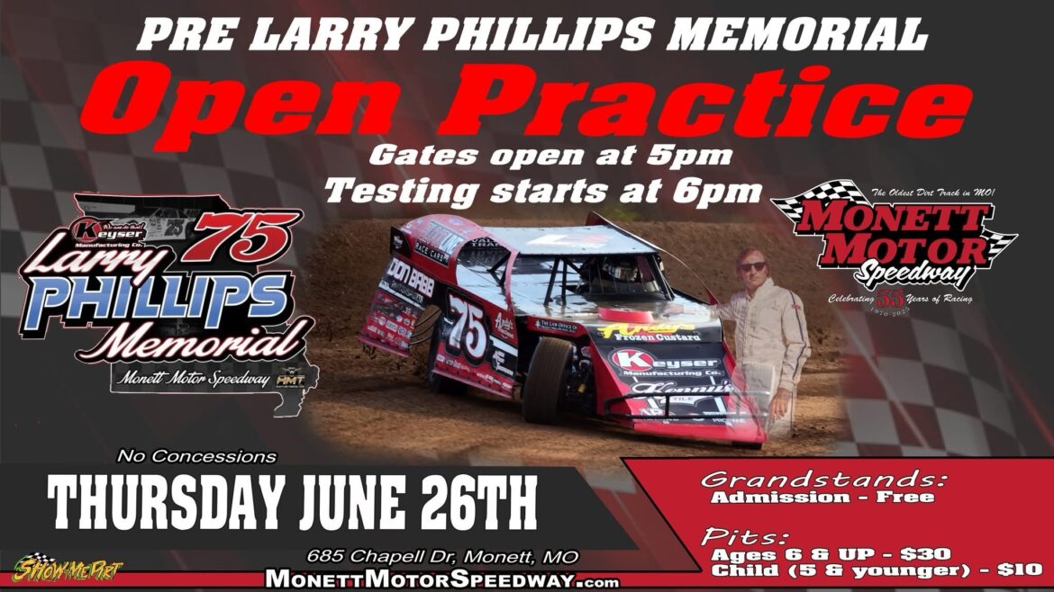 For those interested: There is an Open Practice session next Thursday June 26th ahead of the two-day Larry Phillips Memorial event at Monett Motor Speedway. Details below.