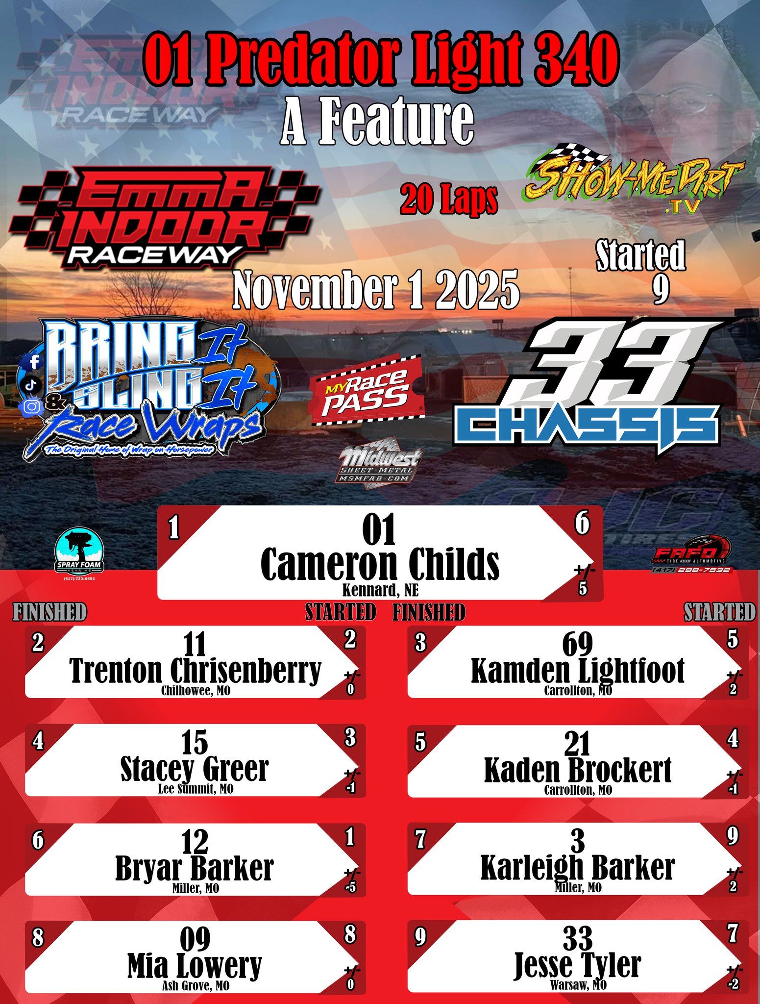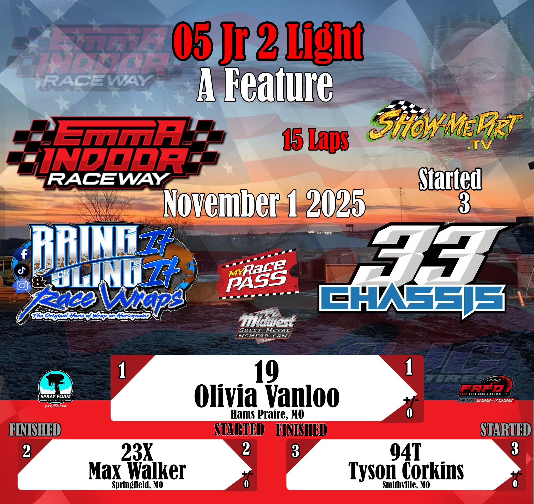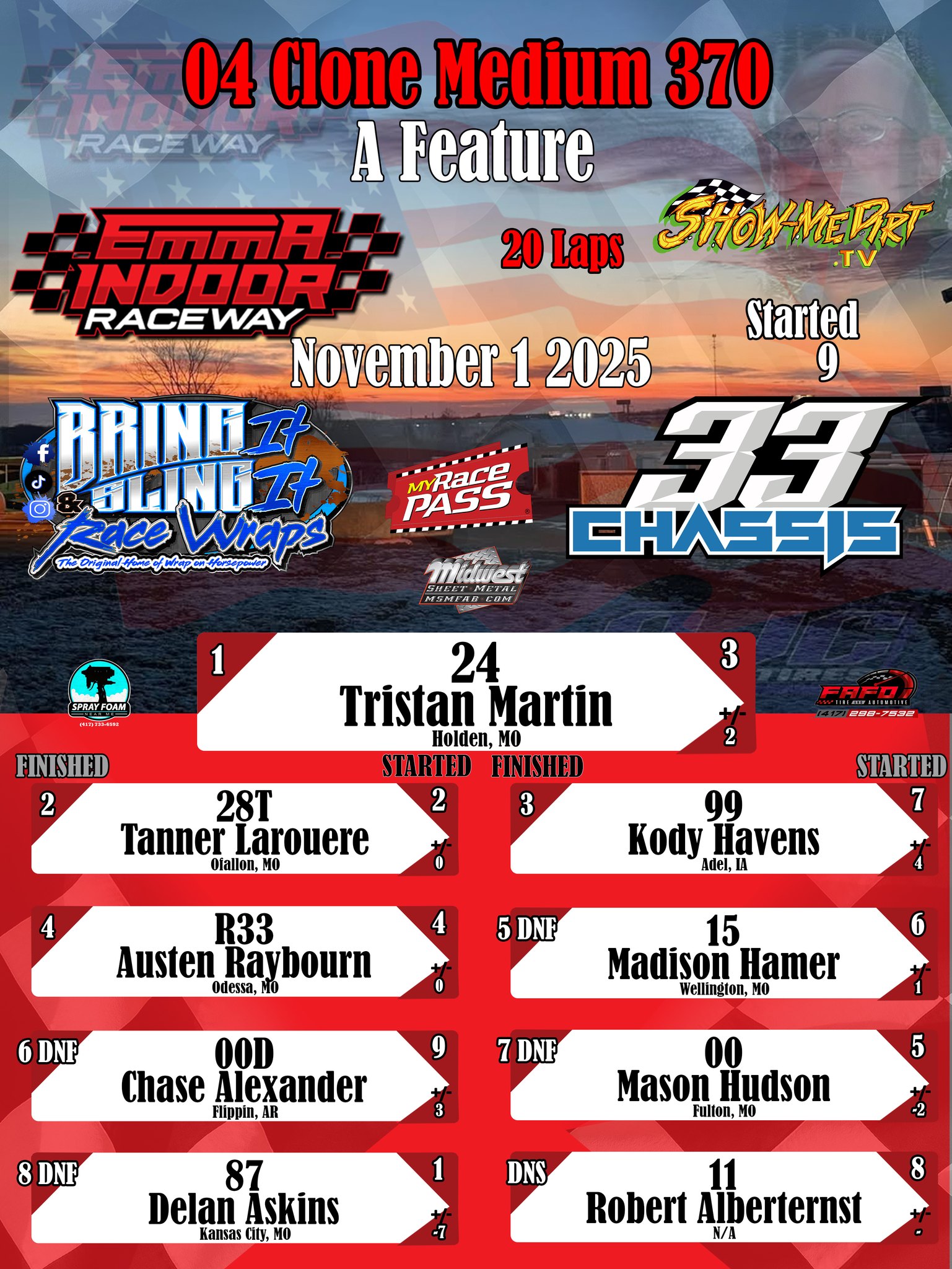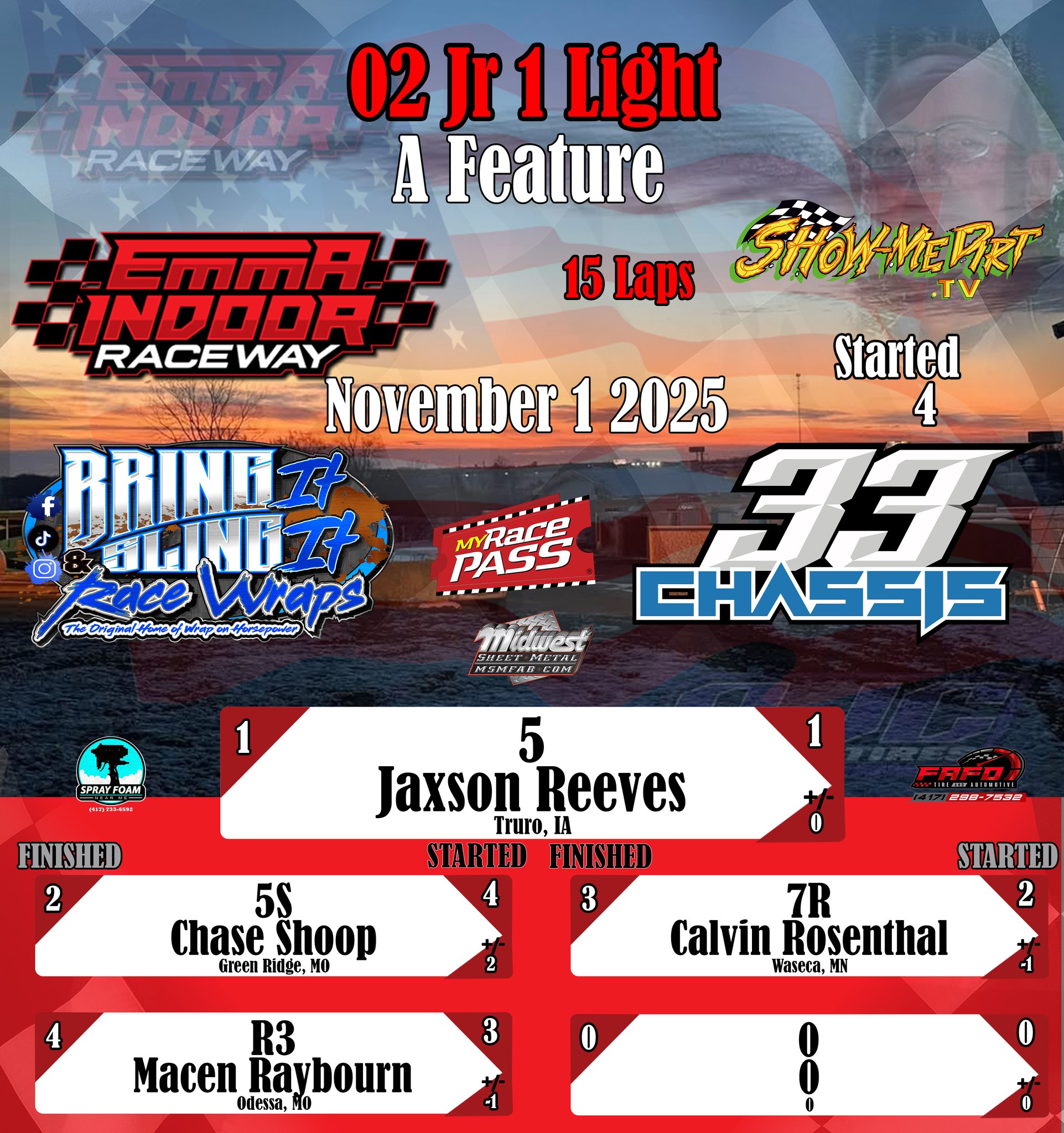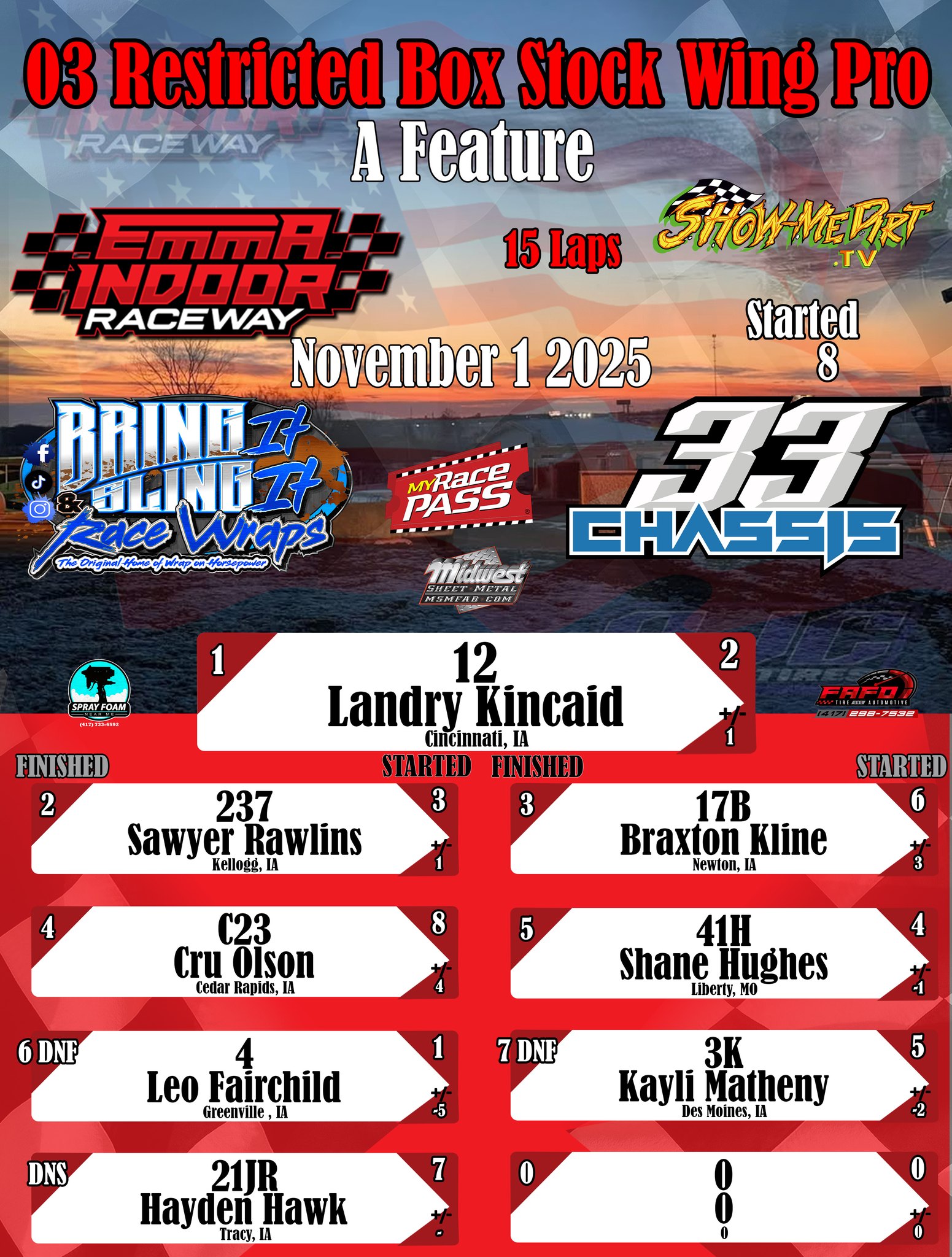 #DirtTrackRacing #LocalRacing #RaceResults #MyRacePass #ShowMeDirt #MidwestSheetMetal #SprayFoamNearMe #FAFOTireandAuto #BringItAndSlingIt #WrapOnHorsepower #33Chassis #11012025 #EmmaIndoorRacewayonMyRacePass @followers
