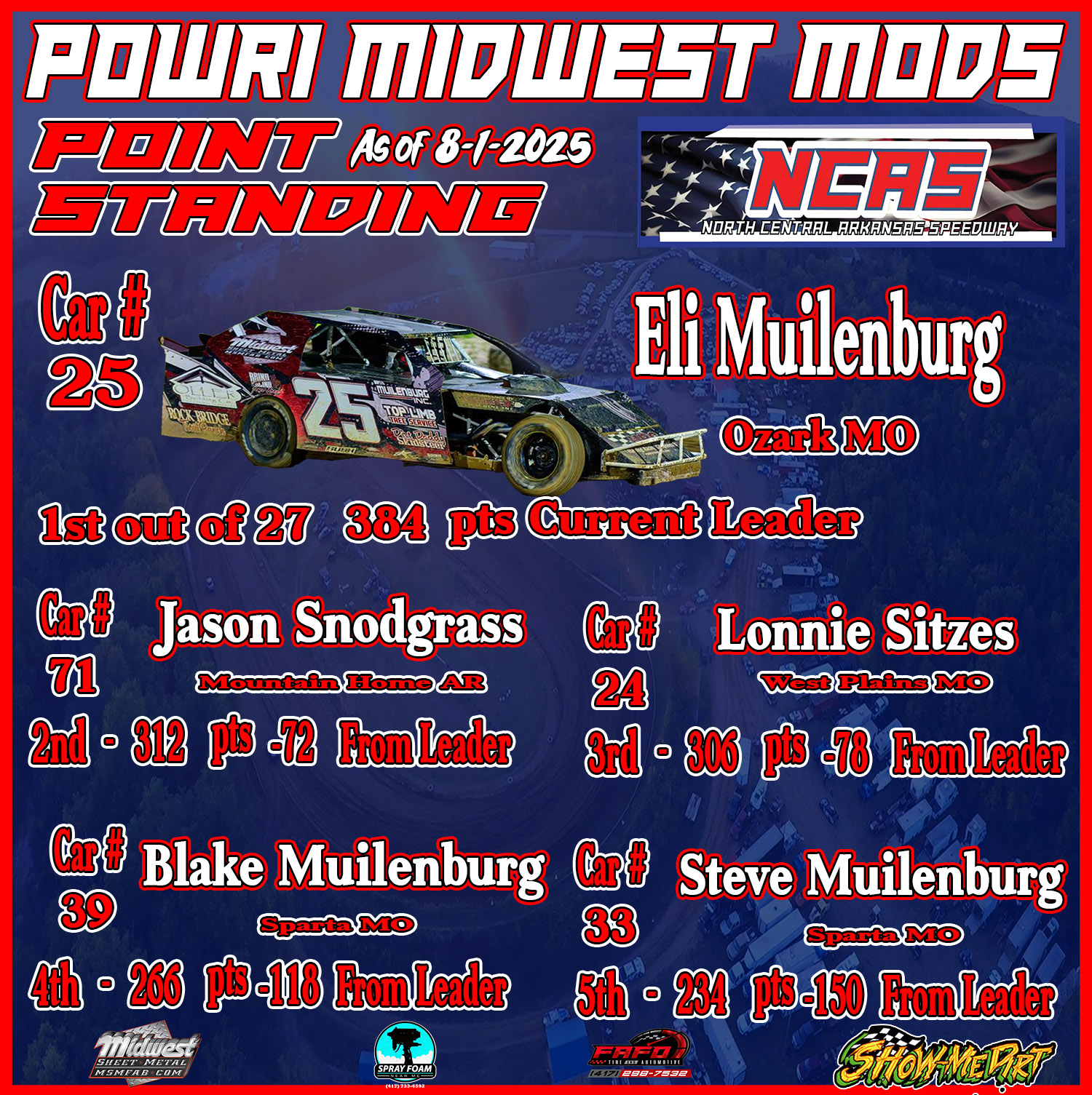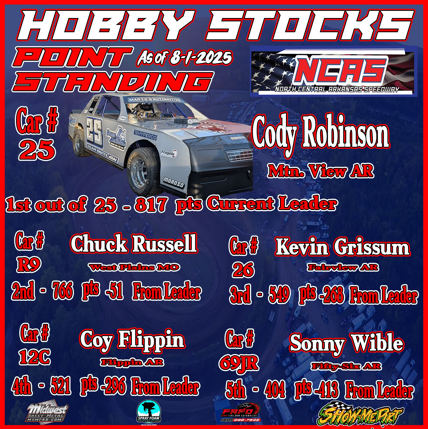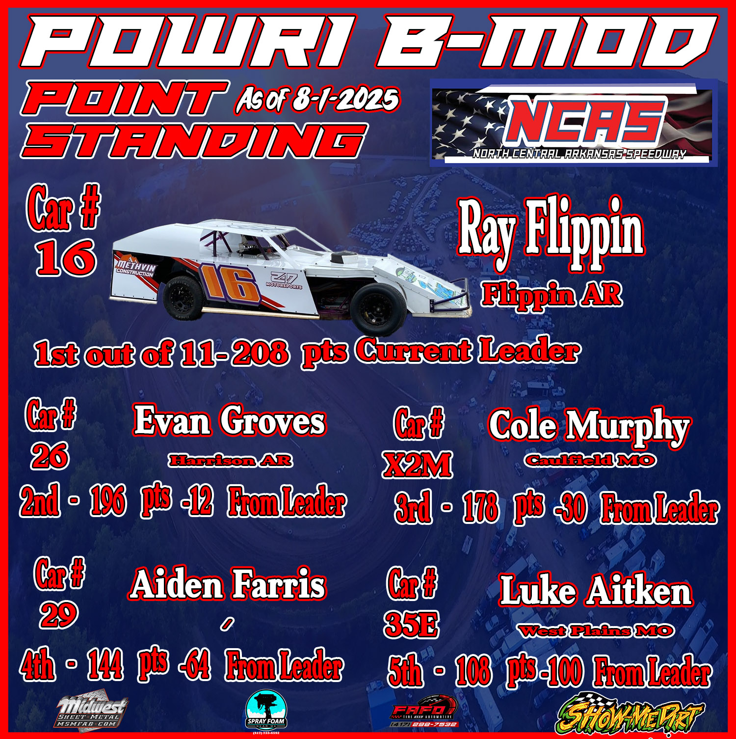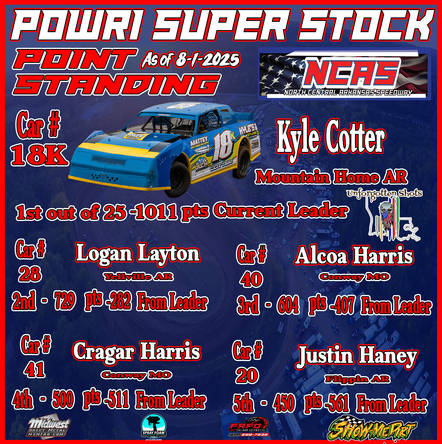 The New North Central Arkansas Speedway Full Points Standing As of 8-1-2025