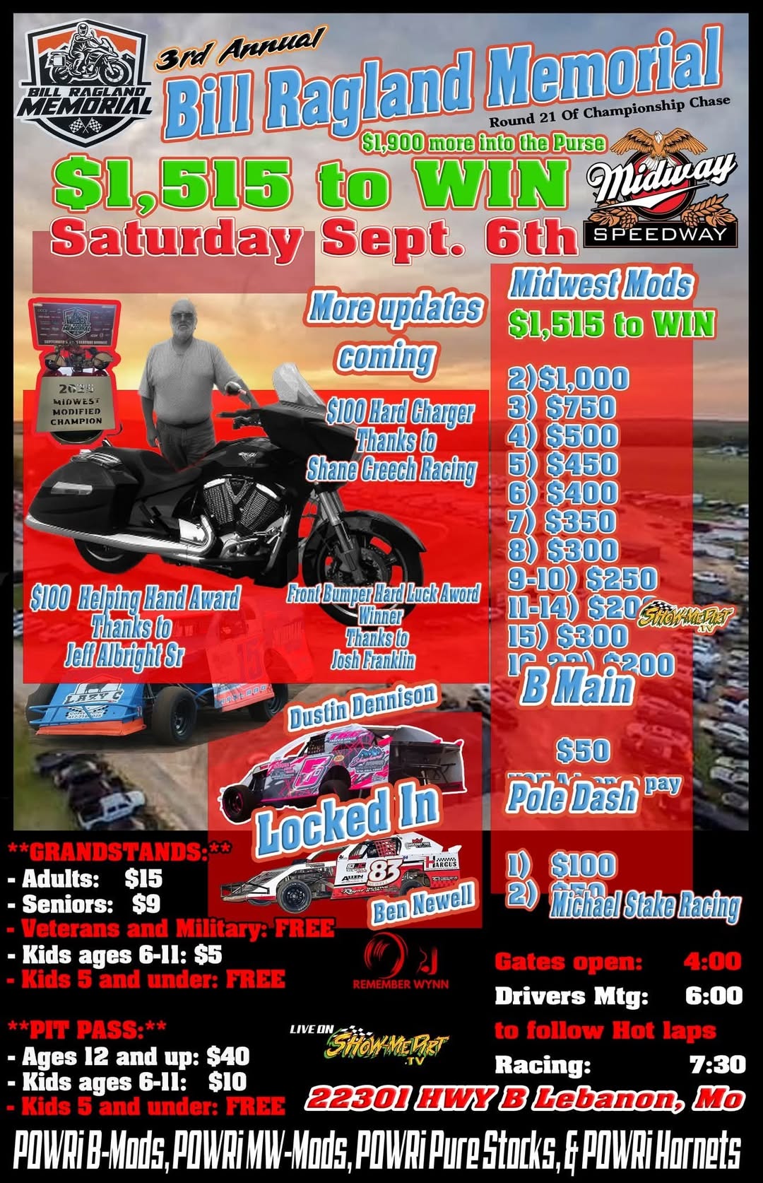 Well we have talked with the track and looks like we are on our way to Midway Speedway in Lebanon,Mo. for the Bill Ragland Midwest Mod Memorial race Saturday night! Havent been to midway this season but are excited to go support the Ragland family and this event! Bring those kids out early and lets have some fun 🤠🤠🤠🤠