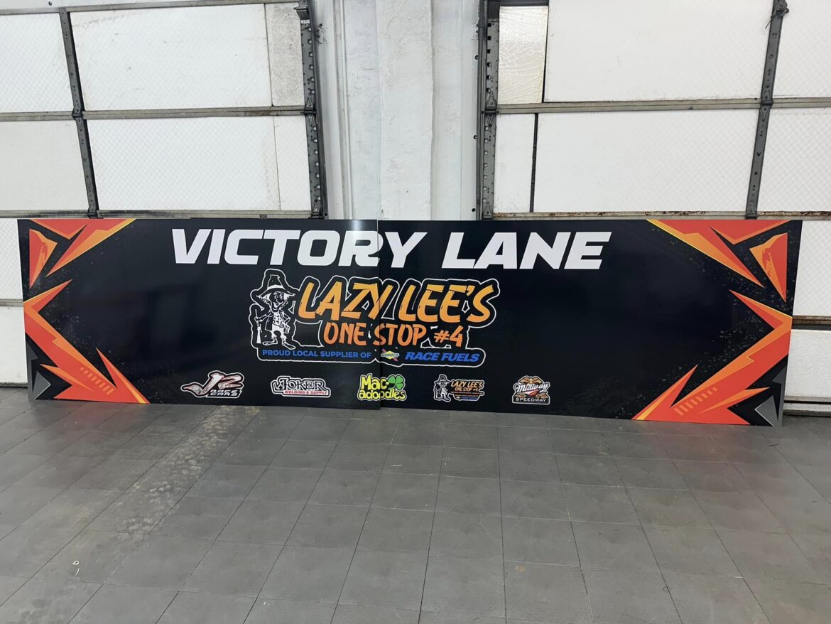 New Victory Lane signage for Lebanon Midway Speedway sponsored by Lazy Lees One Stop #4.