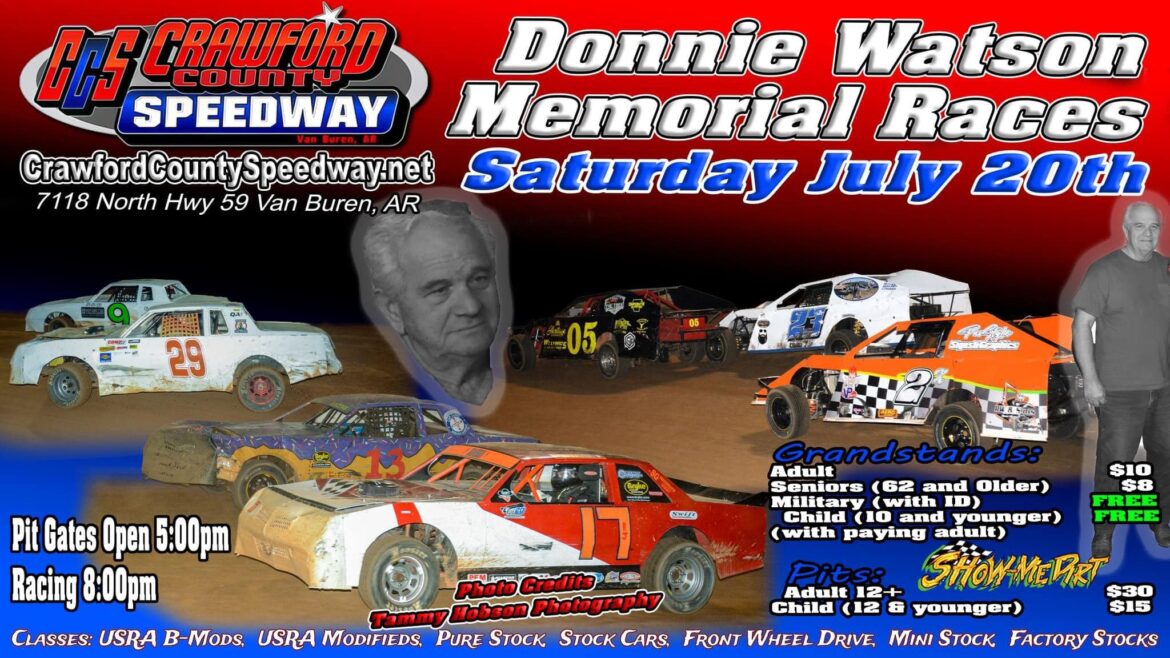 🏁Donnie Watson Memorial Races🏁 We hope to see YOU this weekend for the Donnie Watson Memorial Races at Crawford County Speedway. Racing will start at 8:00 p.m. with the pit gate opening at 5:00 p.m.