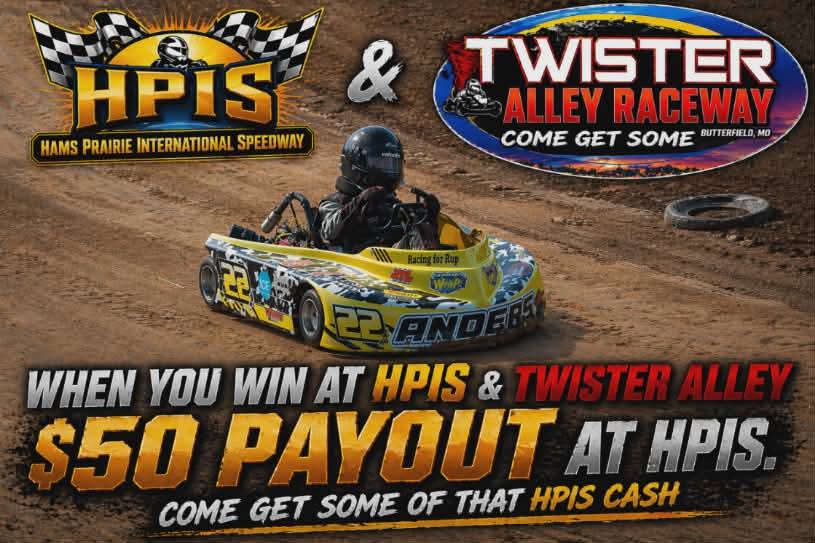 Talked it over with Lonnie Wymans Promoter at HPIS, sounds like a Good Deal and I will honor it at Twister. If you Win at Twister Alley and Race the next Event at HPIS and Win Twister will pay you the Bonus $50!
