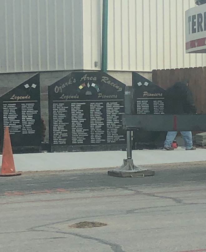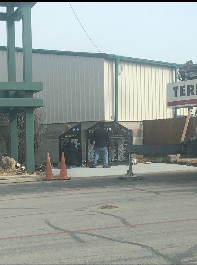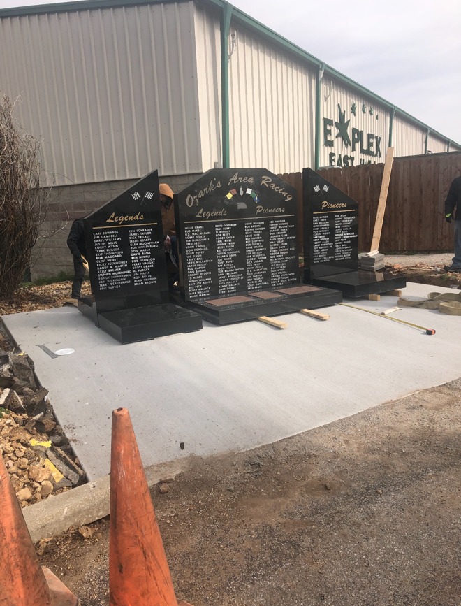 The monument was placed today at it’s new home inside the Ozark Empire Fairgrounds. A special thank you goes out to Jake Diemer and everyone at Greenlawn Funeral Homes, without their help along with all of the great donors that stepped forward to make this event possible! This is just first step of many to come to help preserve the great racing history and the people who made it!