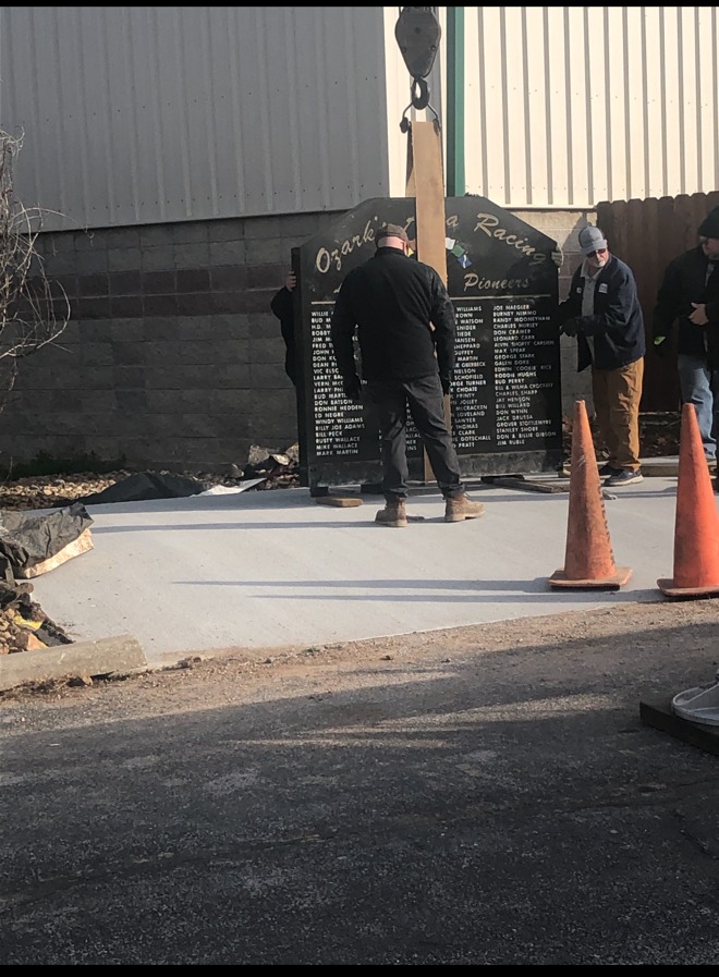 The monument was placed today at it’s new home inside the Ozark Empire Fairgrounds. A special thank you goes out to Jake Diemer and everyone at Greenlawn Funeral Homes, without their help along with all of the great donors that stepped forward to make this event possible! This is just first step of many to come to help preserve the great racing history and the people who made it!