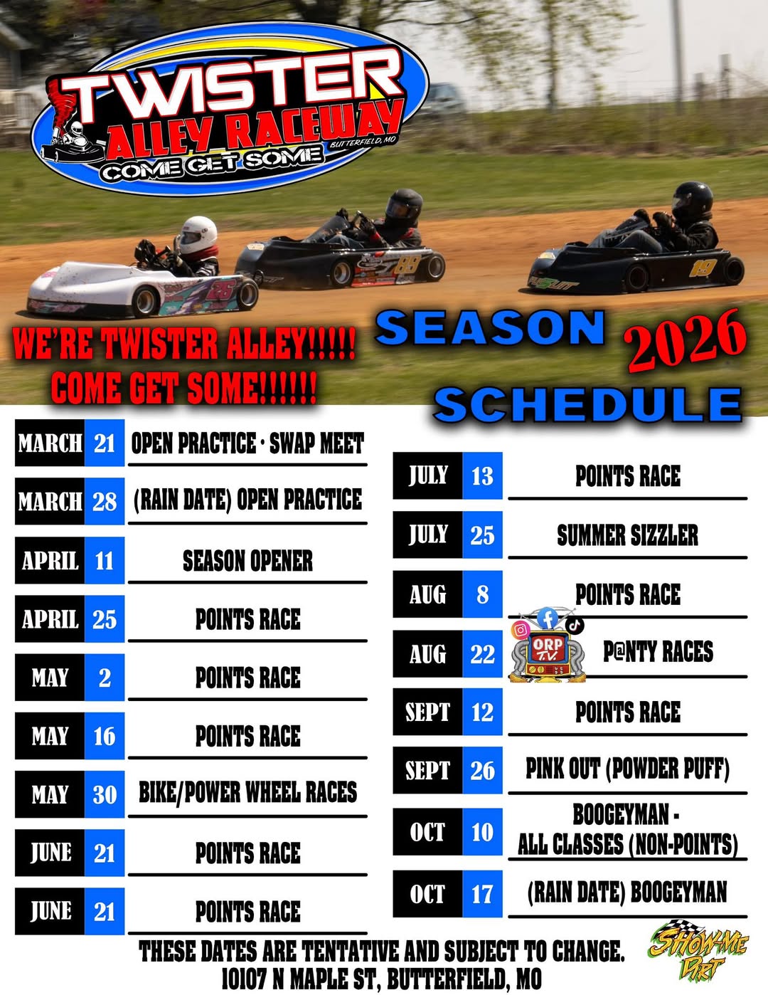 Uncategorized The Twister Alley Raceway 2026 racing Schedule. Get those dates put into your … by Show-Me Dirt February 2, 2026 written by Show-Me Dirt February 2, 2026 6 The Twister Alley Raceway 2026 racing Schedule. Get those dates put into your racing schedules. Source AlleyDatesputRacewayRacingScheduleTwister 0 comments 0 FacebookTwitterPinterestThreadsBlueskyEmail Show-Me Dirt previous post Here is the tentative 2026 schedule, additional details TBA. Also available on … You may also like Here is the tentative 2026 schedule, additional details... February 2, 2026 If you are a family member of an... February 1, 2026 Nick Bradshaw Perseverance Award | Racing Legend With... February 1, 2026 Russell Baker Hall of Fame Induction | Ozarks... February 1, 2026 Did anyone capture a photo of the @Legit... February 1, 2026 Pre-registration is now OPEN for Karts Points Race... February 1, 2026 Monett Motor Speedway is ready to take us... February 1, 2026 Show-Me Dirt added photos to the album: Photos... February 1, 2026 2026 class for the 38th annual Ozarks Area... January 31, 2026 Come be part of the Ozarks Area Racers... January 31, 2026