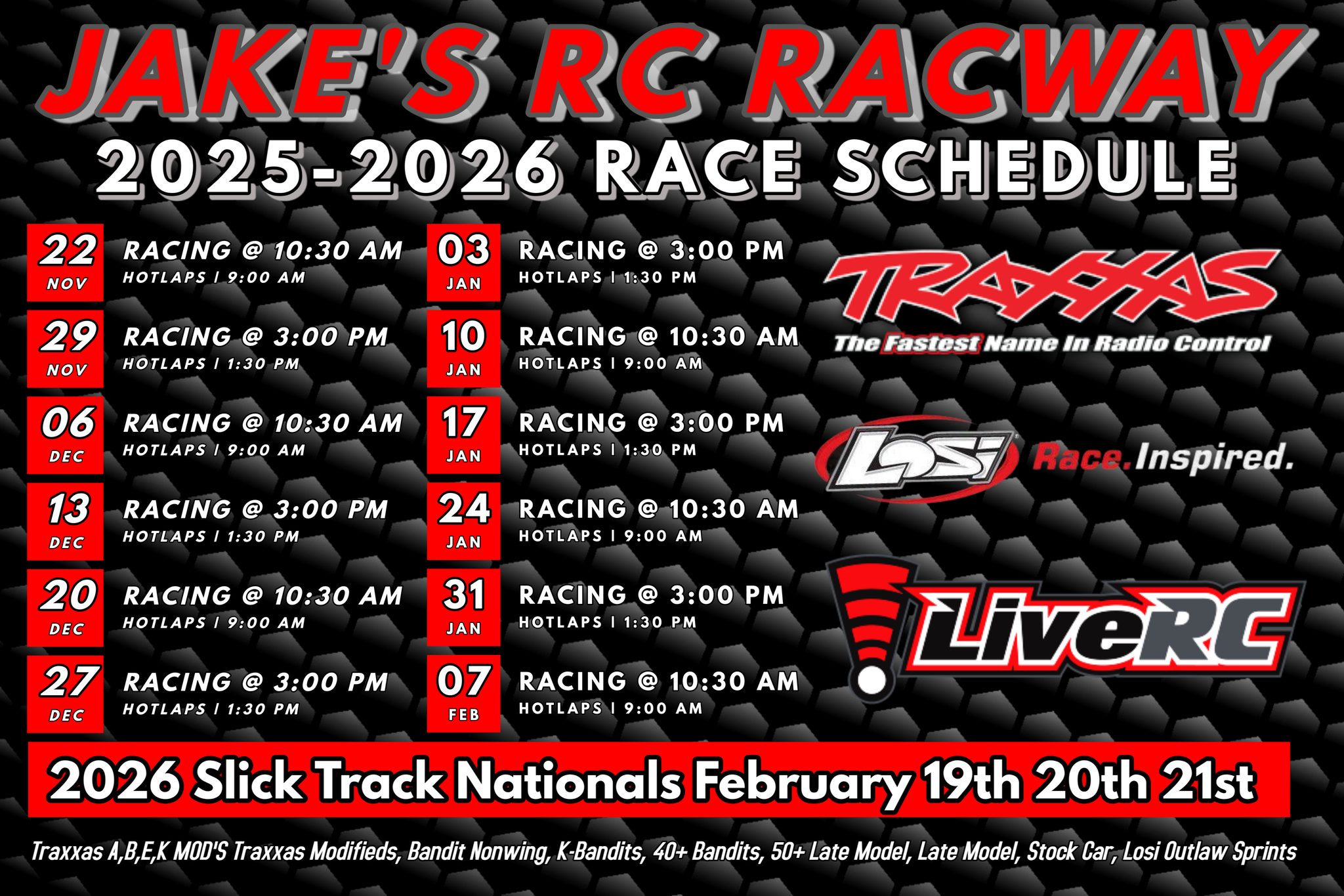 We will be back at the Slick Track National at the Jake’s RC Raceway February 19th 20th and 21st. Come join us for some fun-filled nights of racing.