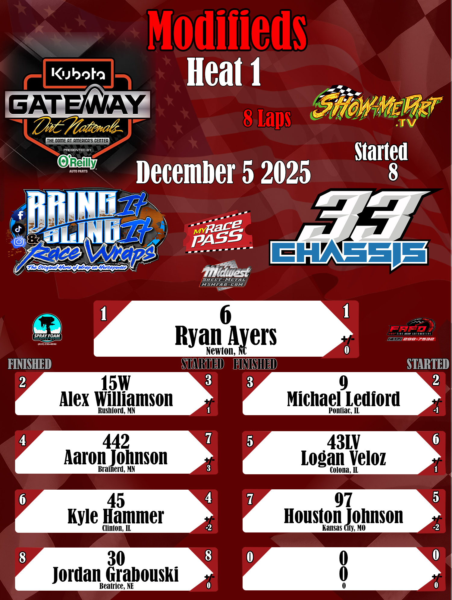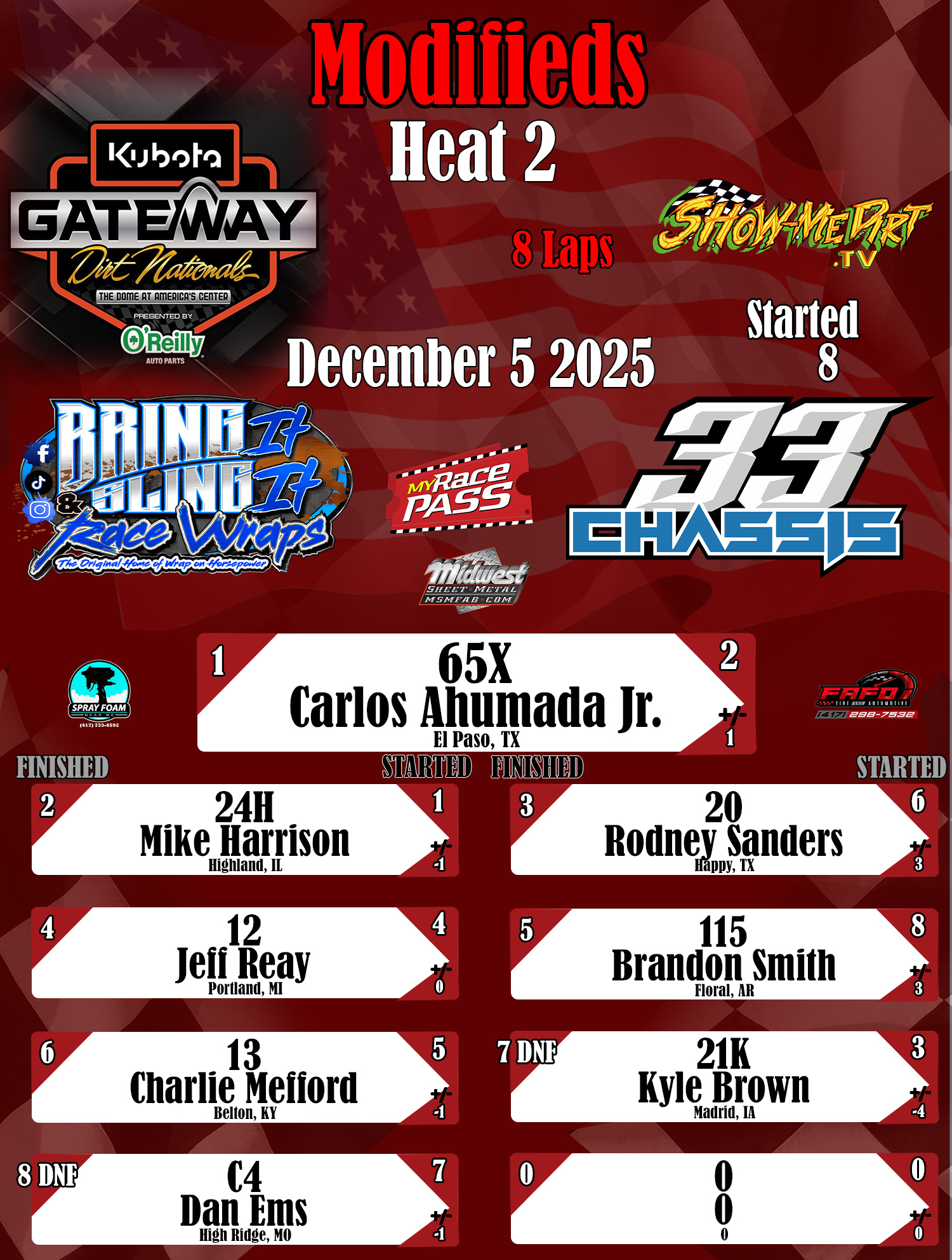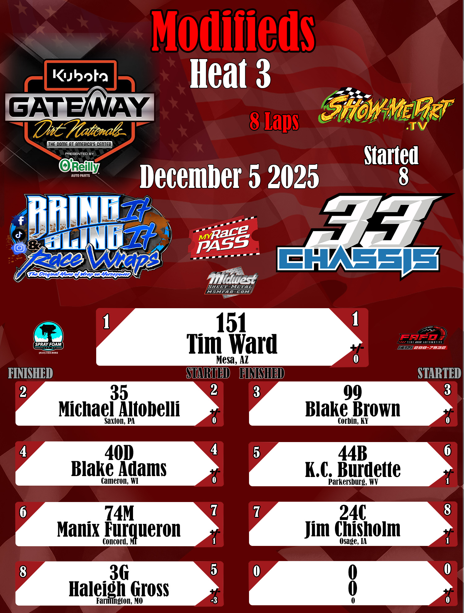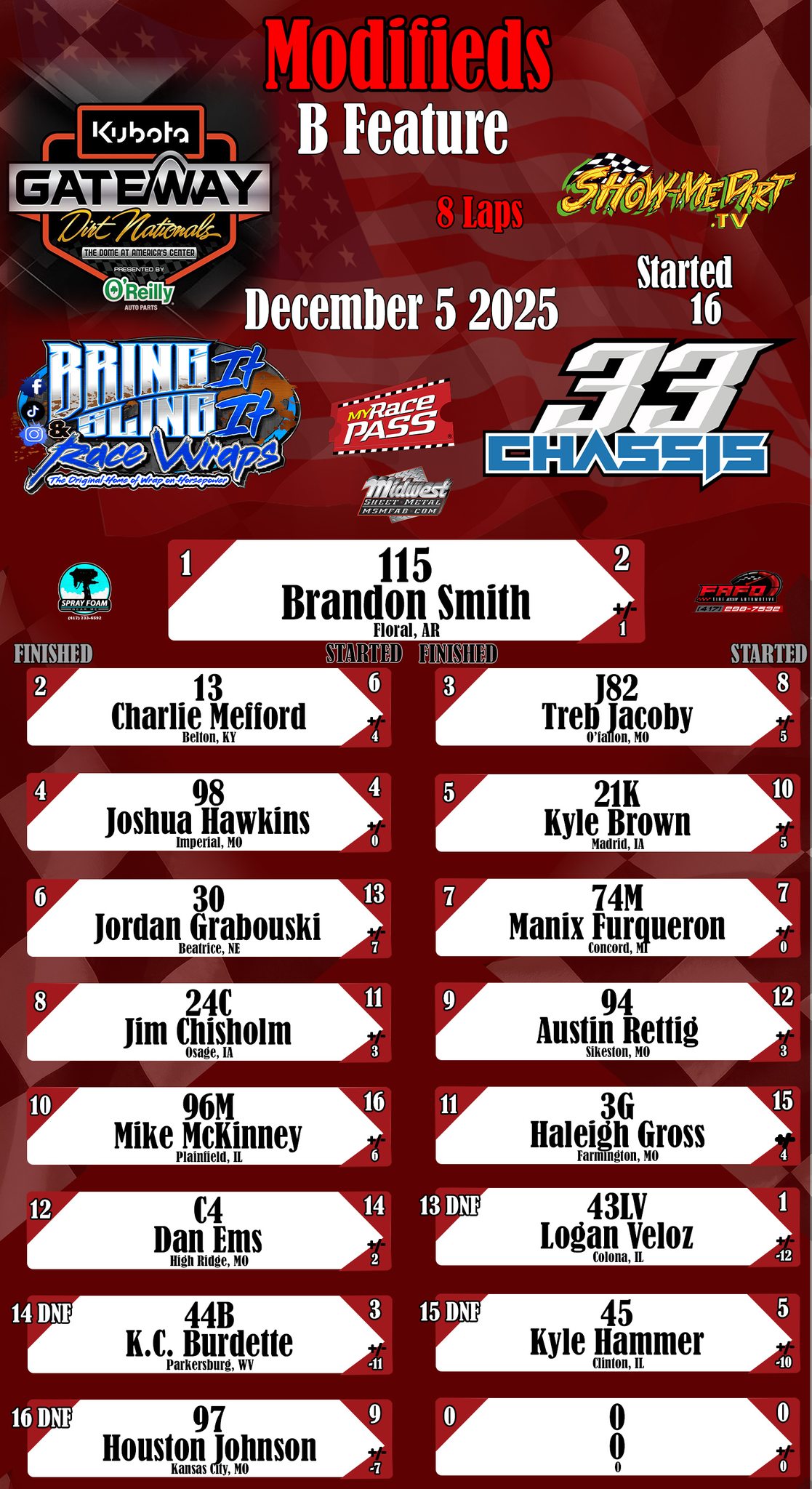 We will be at the Emma Indoor Raceway tomorrow night live, so all results from the Gateway Dirt Nationals will be posted on Sunday.
